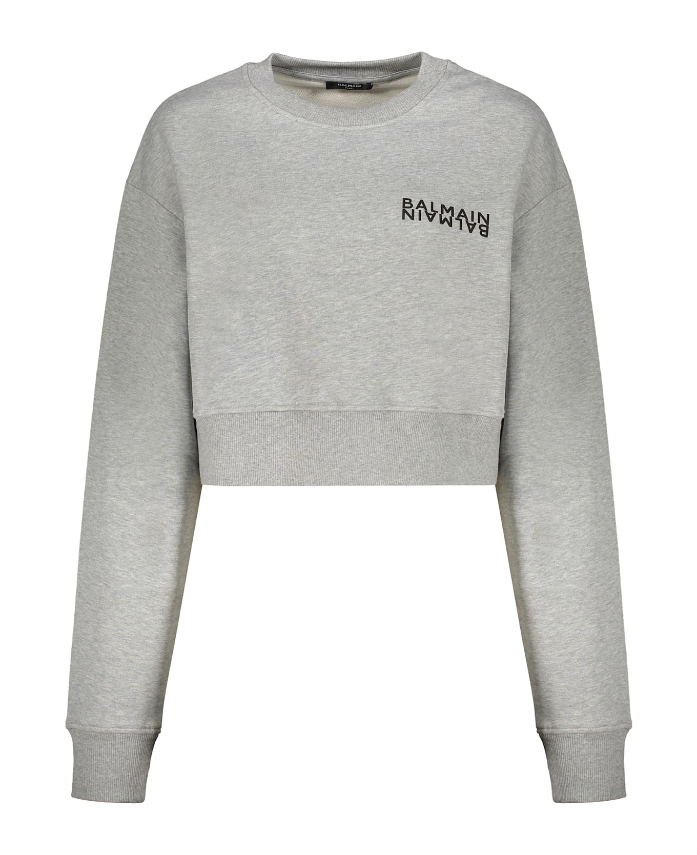 Crop sweatshirt in gray, made from a soft and comfortable fabric. the piece is decorated with a logo on the front, adding a touch of style. perfect to pair with sporty pants or jeans for a casual outfit. ideal for fresh days and for a trendy look.
