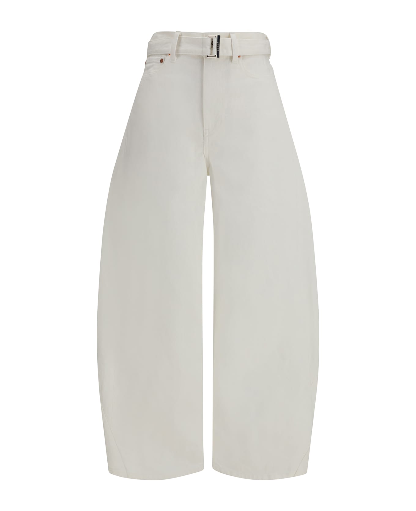 The denim trousers by sacai present a contemporary take on a casual essential through bold volumes and refined construction. featuring a wide-leg silhouette with an arched balloon effect, the design creates a structured yet dynamic shape, balanced by an integrated waist belt that enhances proportions. a classic five-pocket construction and button-and-zip closure complete the piece, blending functionality with sacai s distinctive design approach.