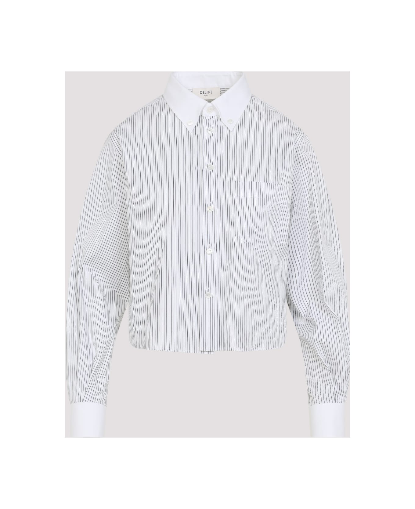 Celine Cropped White and Blue Cotton Shirt. Crafted from striped white and blue cotton, button-down collar, front button fastening, long sleeves with buttoned cuffs, back yoke and boxy pleat, cropped and straight hem.