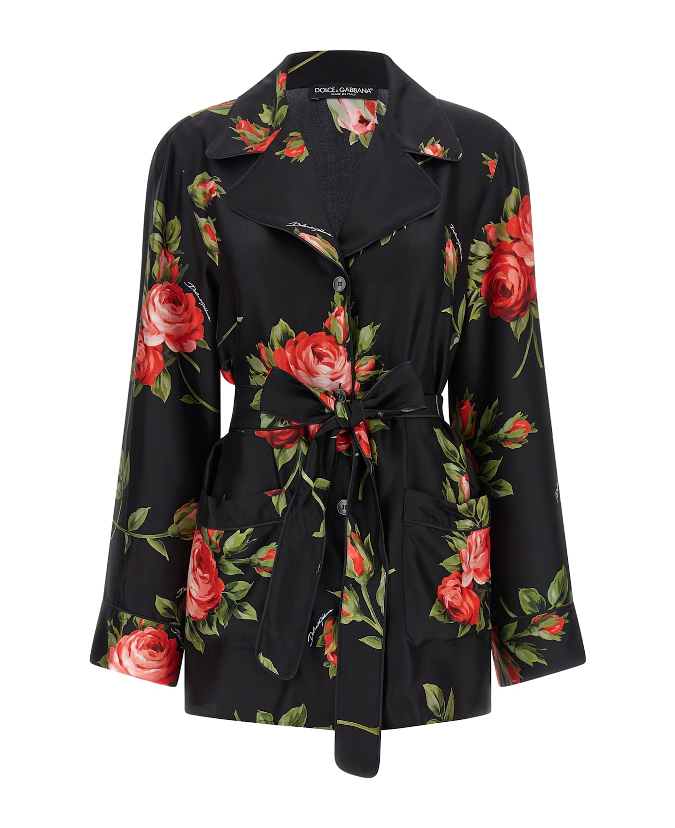'Bouquet Rose' print silk twill shirt, solid color piping, 'Vanity' collar, front button closure, long cuffed sleeves, side slits, removable belt. The differences in print placement you might find on this product is a characteristic of Dolce&Gabbana's Handmade products. A peculiarity that makes each garment or accessory unique and exclusive.