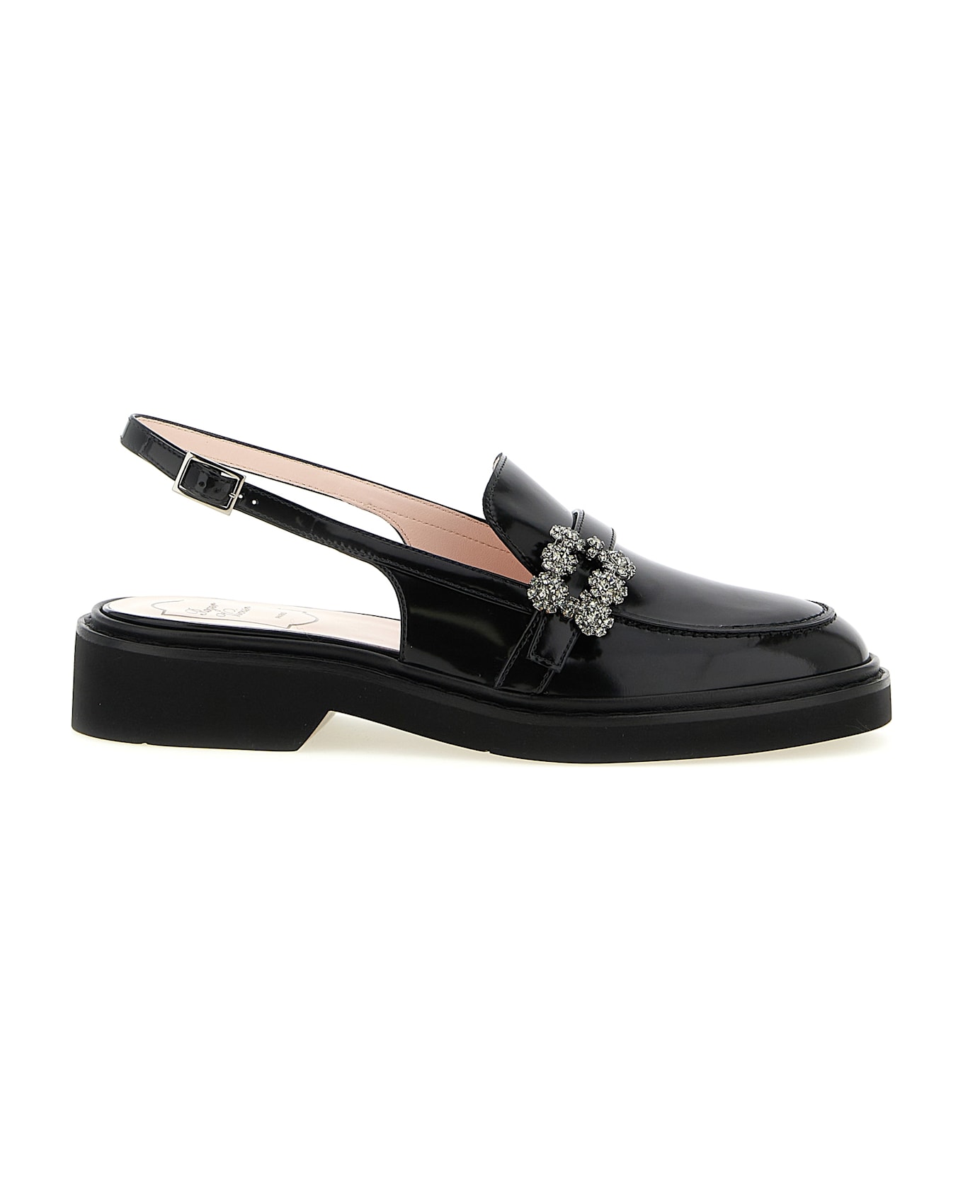 'Viv' Rangers' shiny leather slingbacks, moccasin-shaped front with iconic metal and crystal 'Efflorescence' buckle, adjustable strap, leather welt, rubber sole.