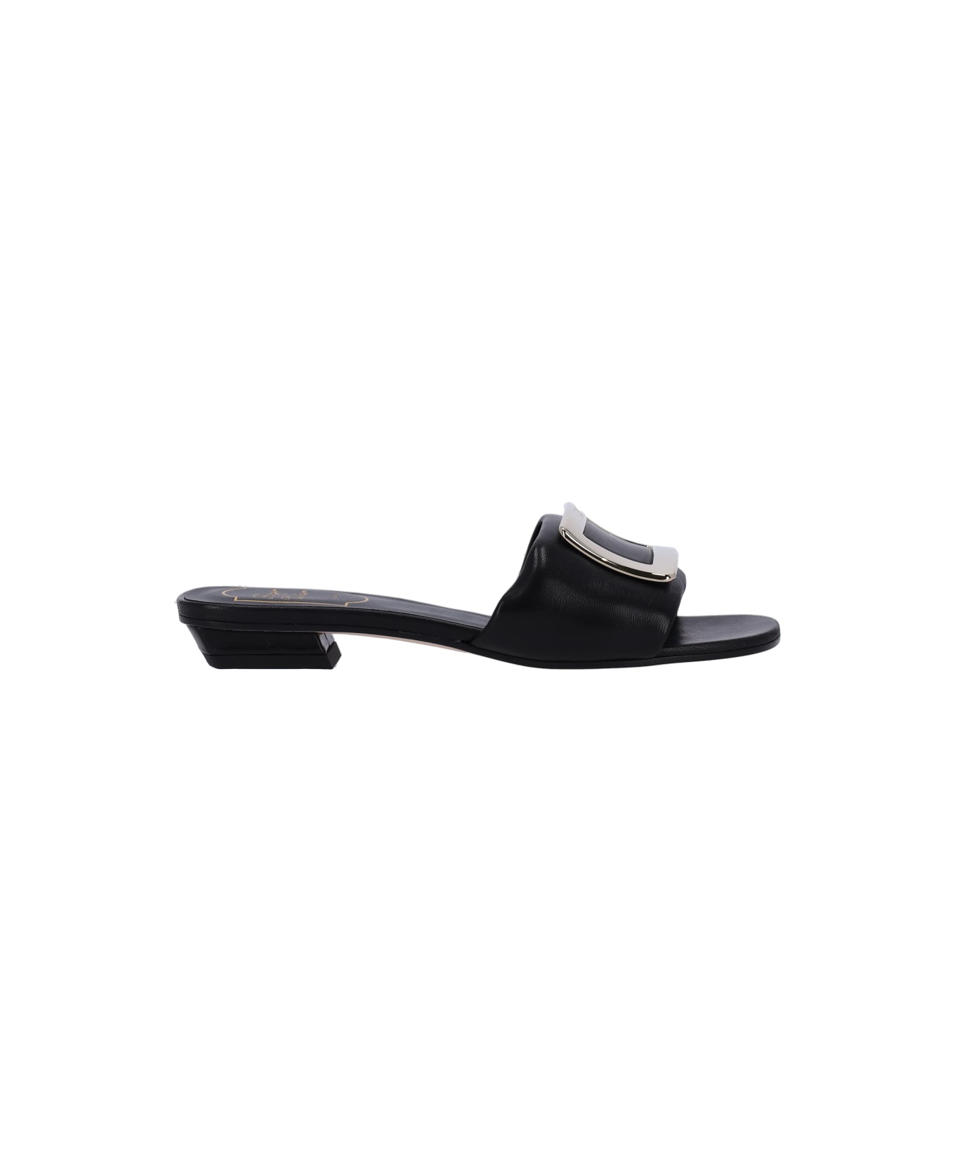 Roger Vivier black lambskin sandals with square toe, top band, gold metal hardware detail, slip-on fit, leather sole.
