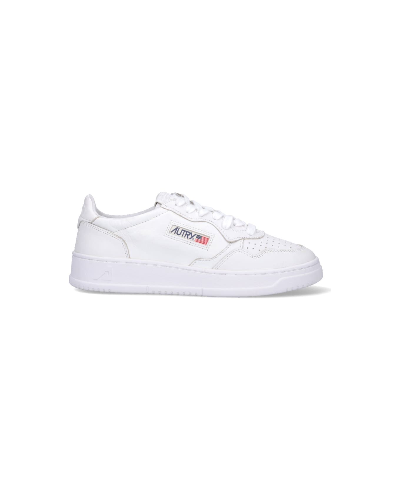 Autry Low 'Medalist' sneakers in white nappa leather with round toe, laces, logo label tongue, blue side logo, black back tab, rubber sole.