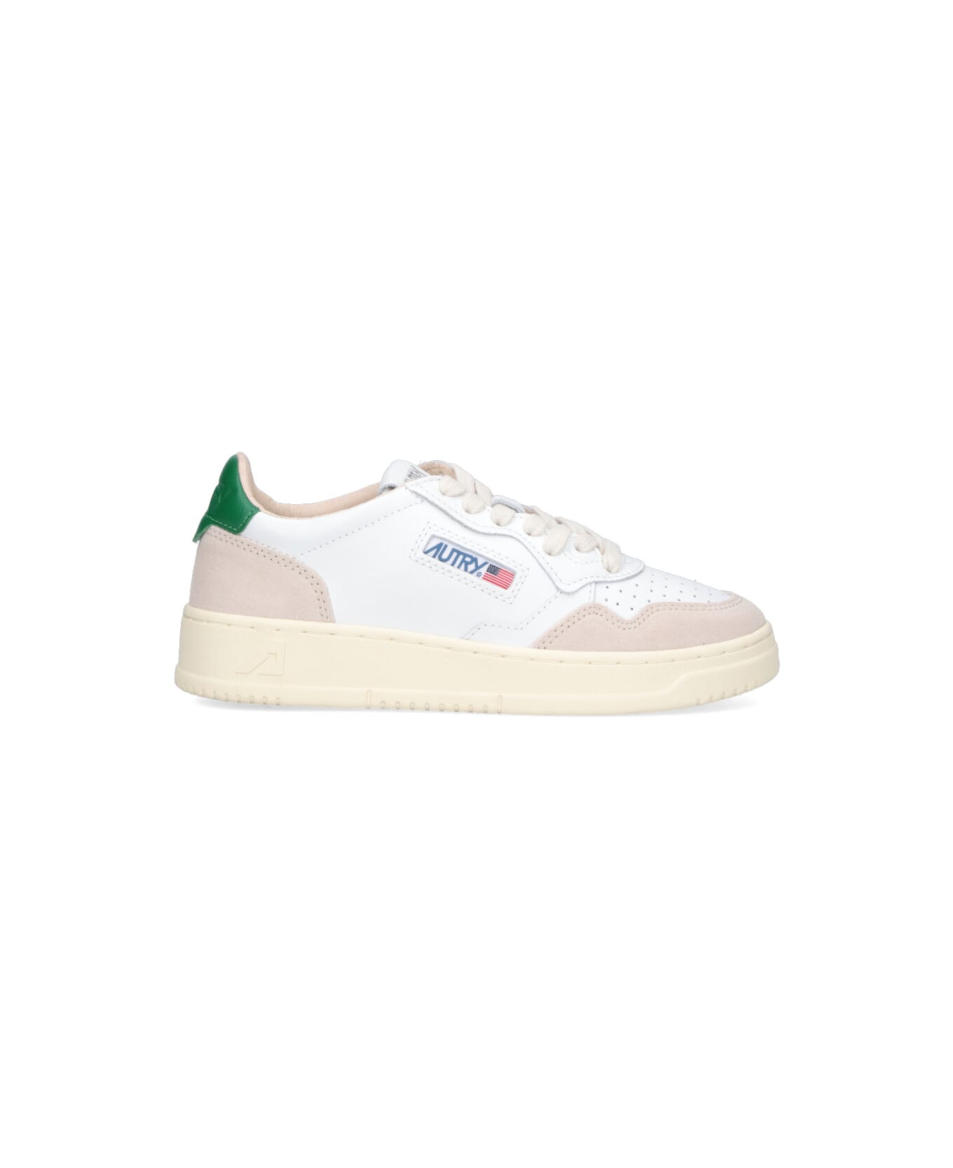Autry Low "Medalist 01" sneakers in white leather with beige suede details, an openwork toe, lacing, logo label, a tongue label, side blue logo, a green back tab and cream rubber sole.