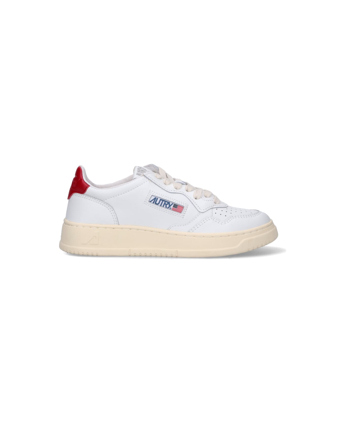 Autry "medialist low" sneakers in white leather with round toe, laces, logo label on the tongue, blue logo on the side, red back tab, cream rubber sole.