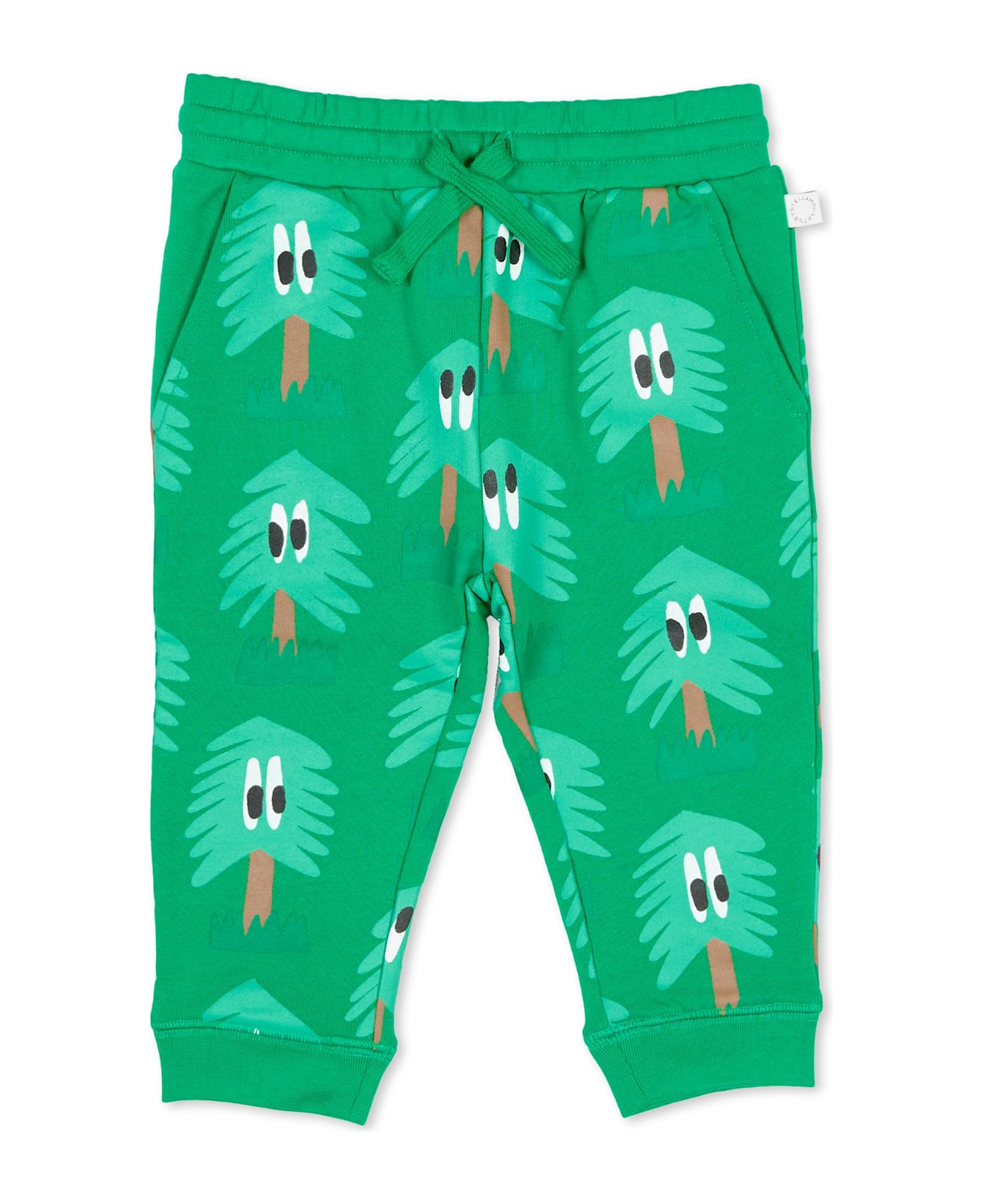Green trackpants, made from fleece cotton, with elastic waistband with laces, side pockets and back pocket and elastic leg- cuffs; thet are embellsihed with all- over print with fir trees.