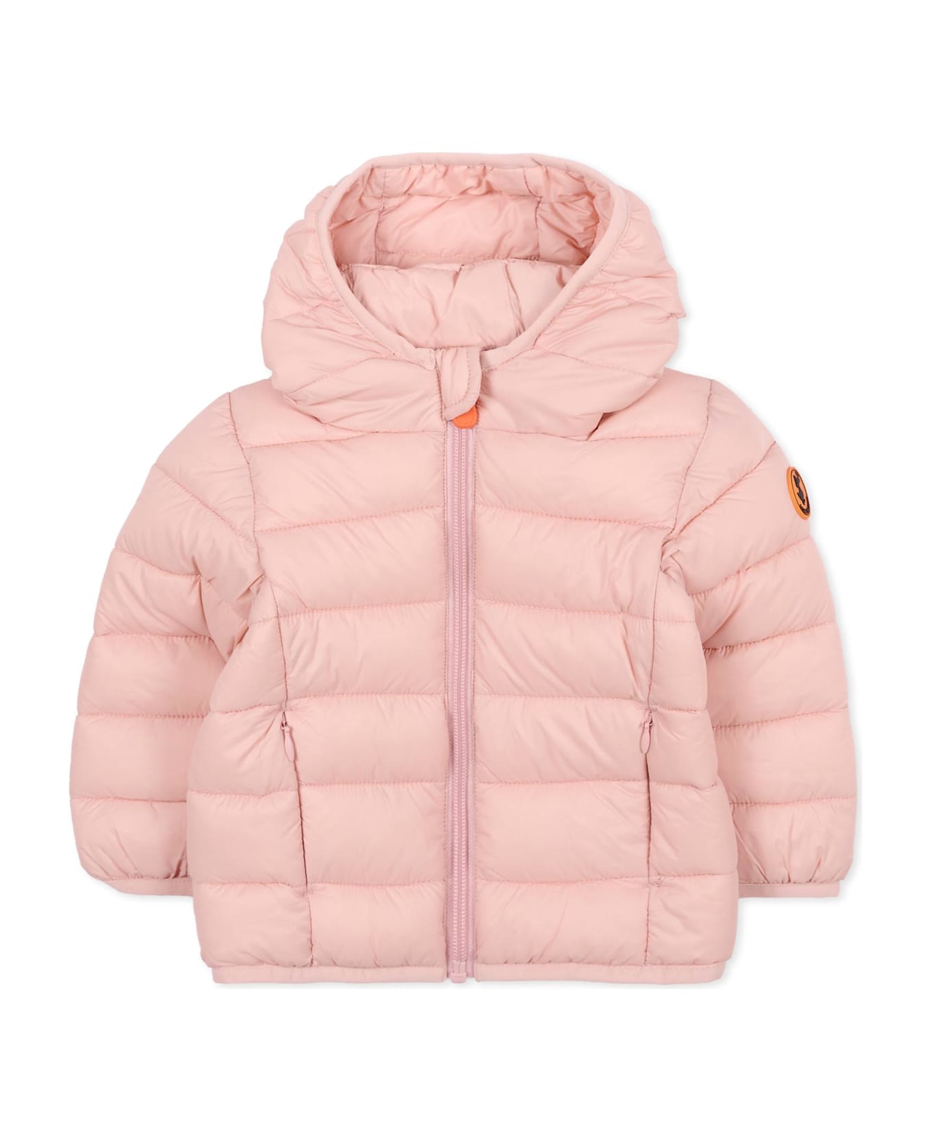 Lightly padded pink down jacket with long sleeves, a hood, a front zip fastening, side pockets, and slightly elasticated cuffs and hem. It is padded with Plumtech, a synthetic thermal wadding made with respect for the environment and animals; it is breathable and retains heat. It is embellished with a rubber logo patch on the sleeve.