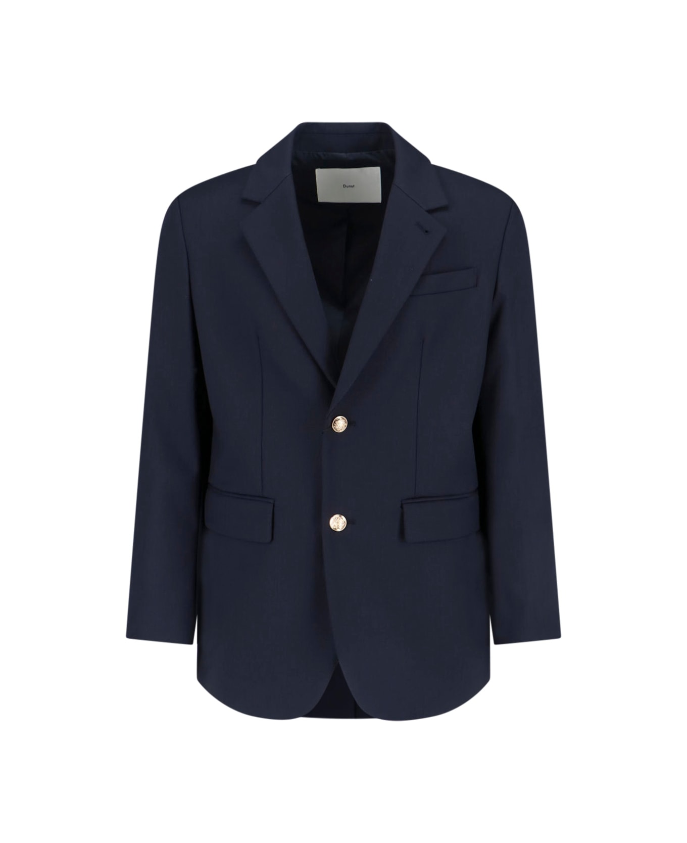 Navy blue wool blend single-breasted blazer Dunst lapels, long sleeves, single-breasted button closure on the front, two front flap pockets, welt pocket on the chest, button cuffs, curved hem.