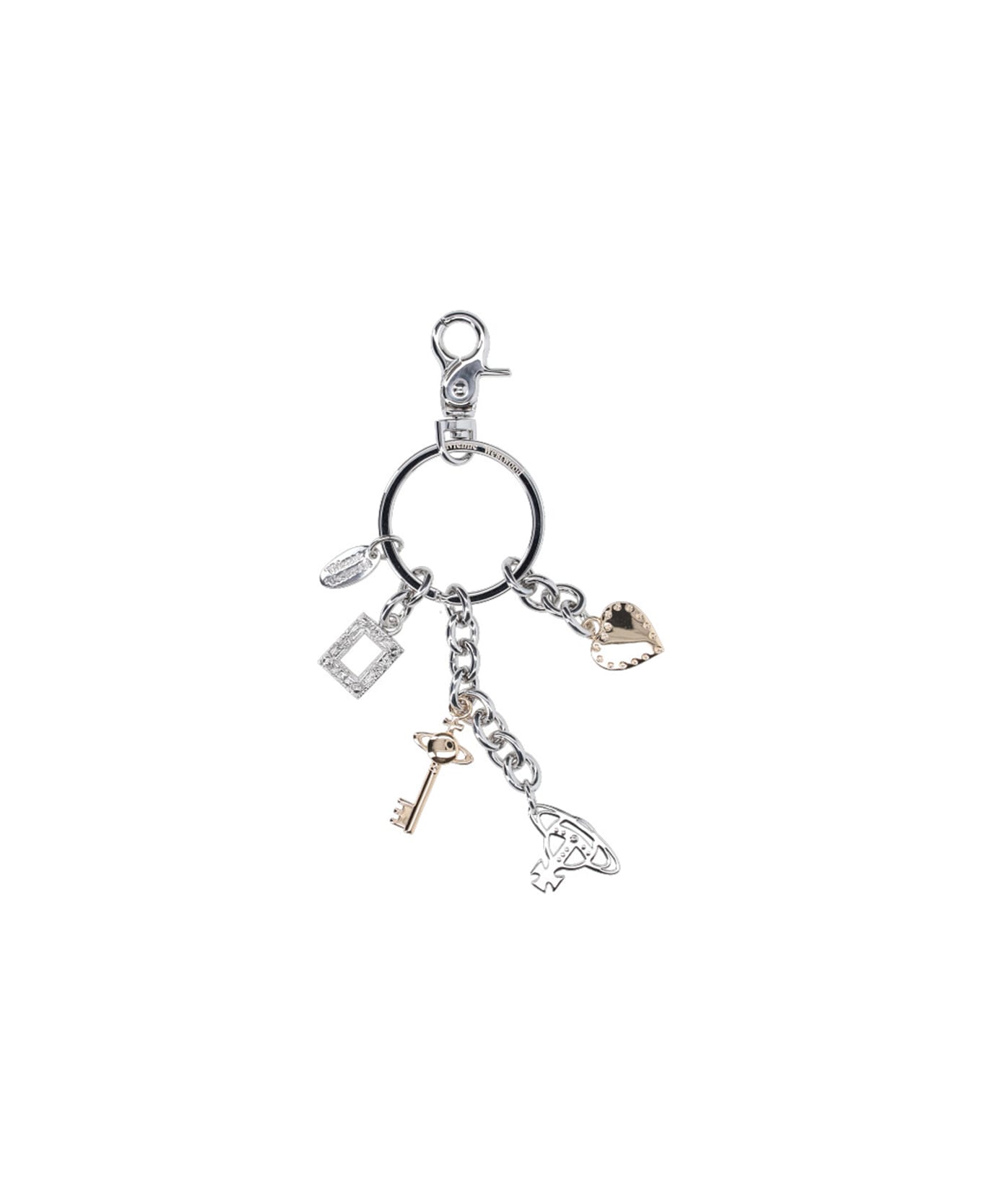 Vivienne Westwood 'multi charm' keychain charm in silver metal, keyring ring, snap hook, charms and 'orb' logo. Composition: 100% Zamac