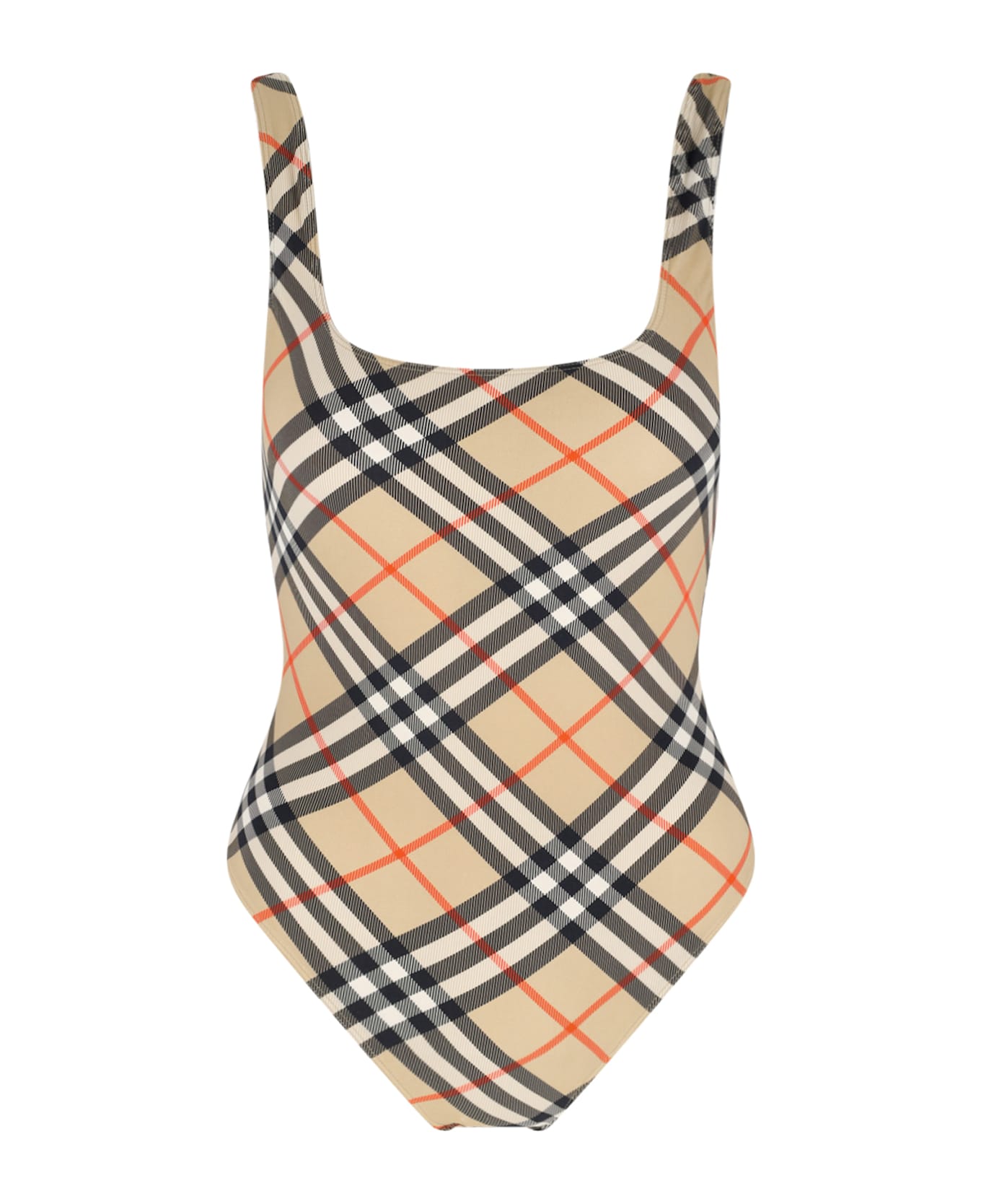 Burberry check one-piece swimsuit in beige stretch fabric with all-over check pattern, shoulder straps, and low-cut back. Composition: 73% Polyamide, 27% Elastane