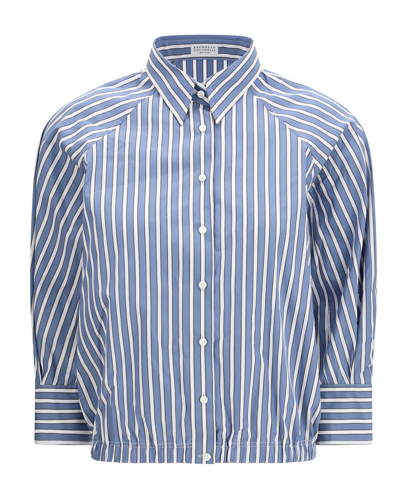 The shadow stripe poplin shirt by brunello cuccinelli blends contemporary elegance with refined tailoring. featuring a front closure with mother-of-pearl buttons and a classic collar, it is designed with balloon raglan sleeves that add volume and fluidity to the silhouette. mother-of-pearl buttoned cuffs and an internal elasticated hem ensure a balanced fit, while the nickel-free jewel embellishment provides a distinctive and sophisticated finishing touch. Composition: 100% % Cotton