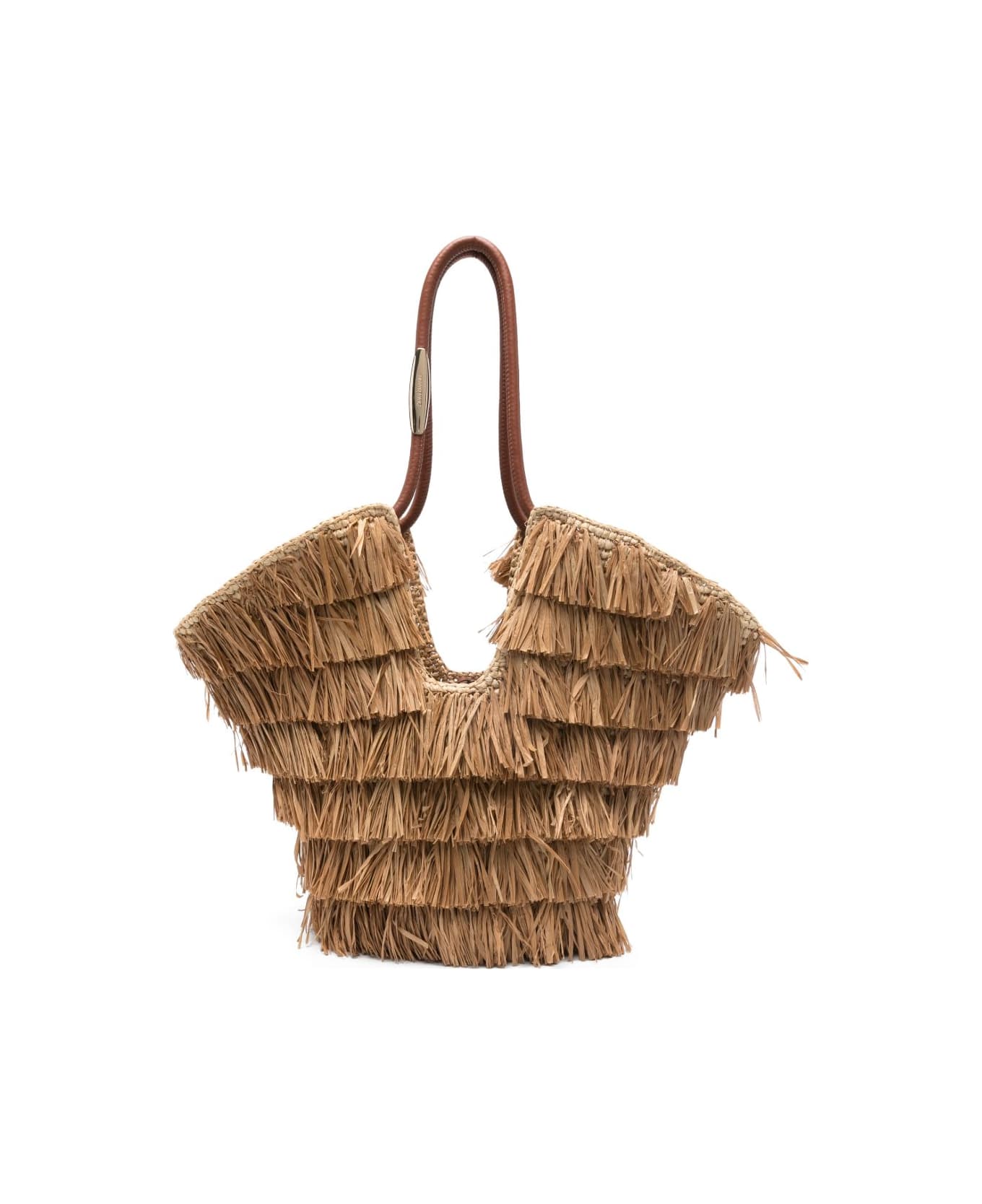 light brown fringed design leather handles gold-tone hardware This piece comes complete with a protective dust bag.