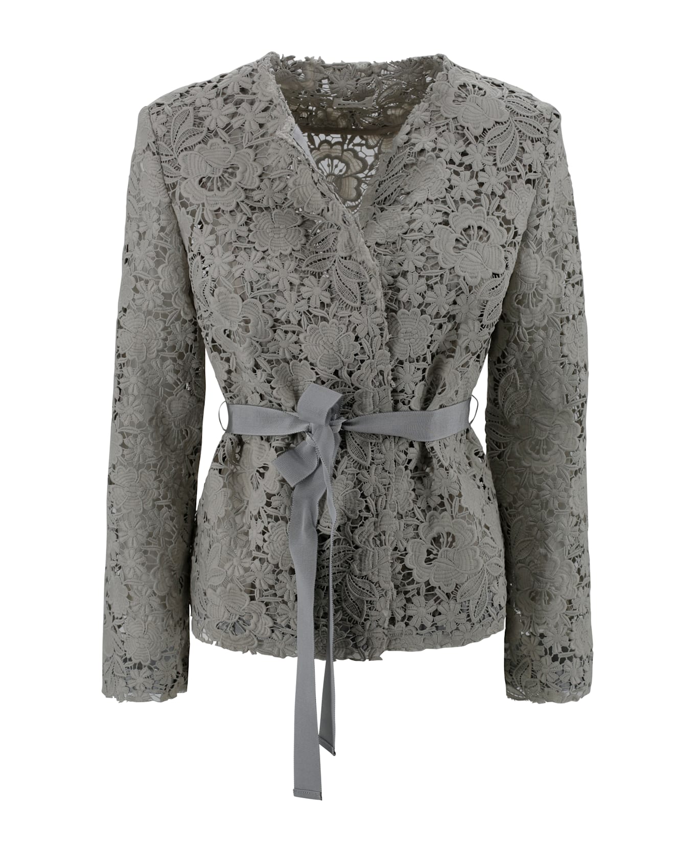 Lace jacket with removable belt, collarless design, long sleeves.