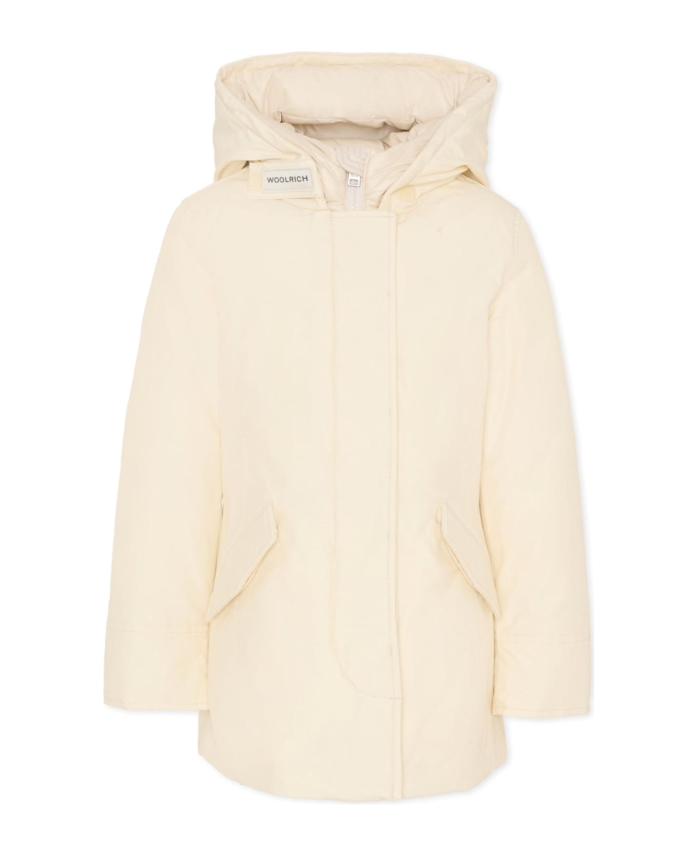 Padded white parka, with quilted hood inside, two slanted flap pockets with button closure, double front closure with buttons and zip, elasticated cuffs. It is embellished with white logo, on the front.