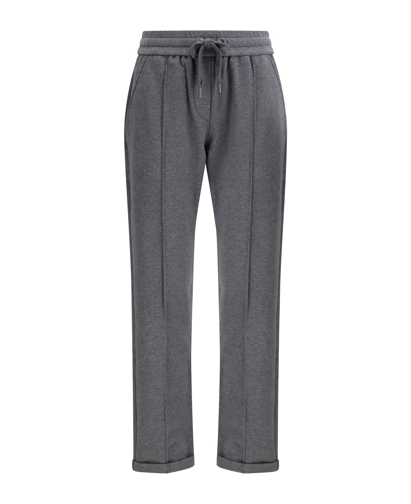 The track stretch-fleece trousers with monili detailing by brunello cucinelli blend effortless comfort with refined craftsmanship. a ribbed elastic waistband with adjustable drawstring offers ease and adaptability, while the side pockets are accented with the brand s signature nickel-free monili embroidery. a stitched front crease brings subtle structure to the relaxed silhouette, finished with a neat cuffed hem. a versatile piece designed to elevate everyday dressing with understated sophistication.