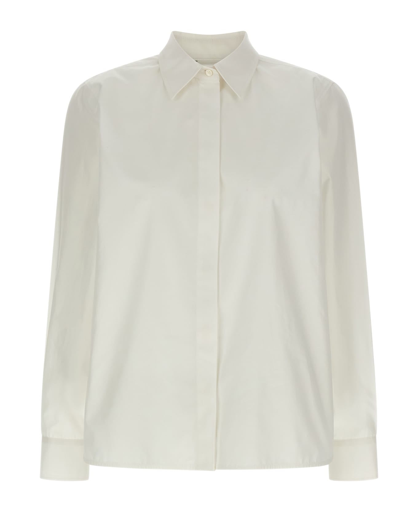 'MxmMaroso' cotton poplin shirt with concealed front button closure, long sleeves with cuffs and metal logo appliqué, rounded hem with side slits.