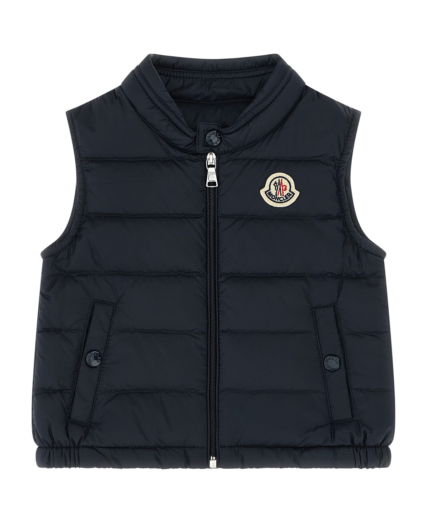 KIDS 'New Amaury' longue vest saison slightly padded with feather, front logo patch, high neck, zip closure, pockets, elastic at the hem, foldable. Midnight blue color. SUSTAINABLE: product made from recycled materials.
