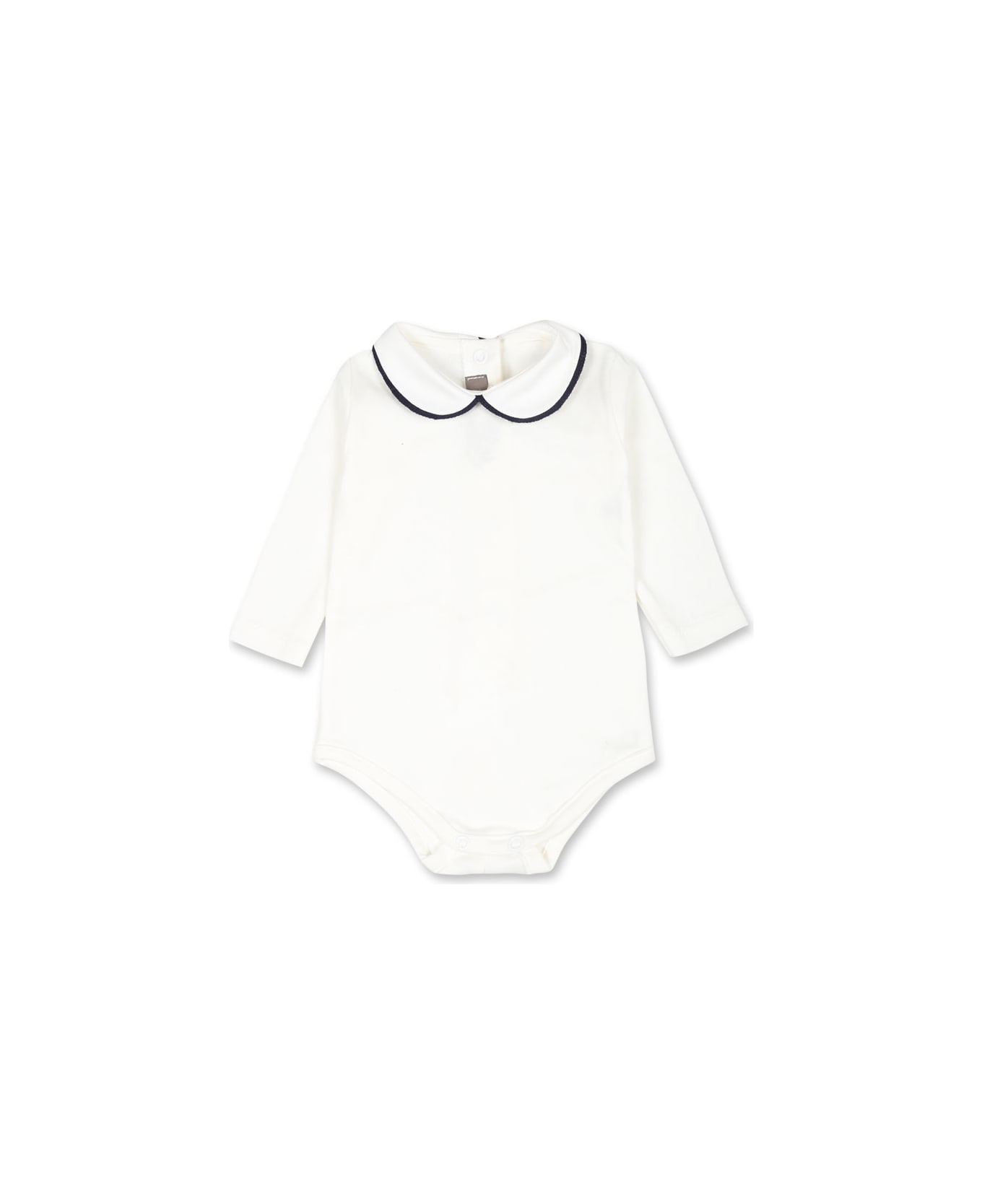 White fleece cotton body with long sleeves, clip closure between the legs and on the back and classic collar embellished with blue profile.