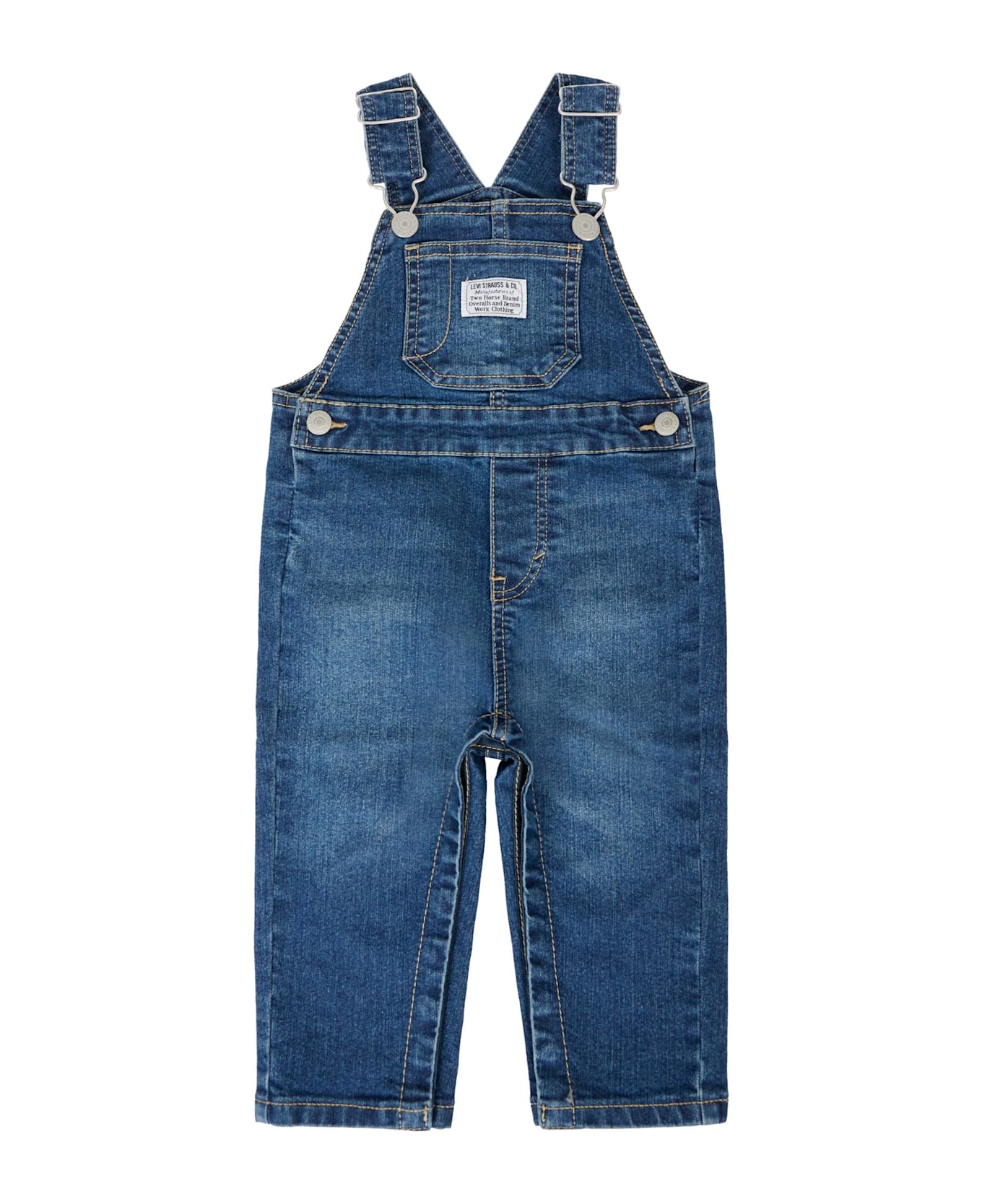 Denim dungarees with adjustable braces with hooks, snap button closure on the sides and between the legs, back pockets and front pocket. It is embellished with logo patches on the front and back.