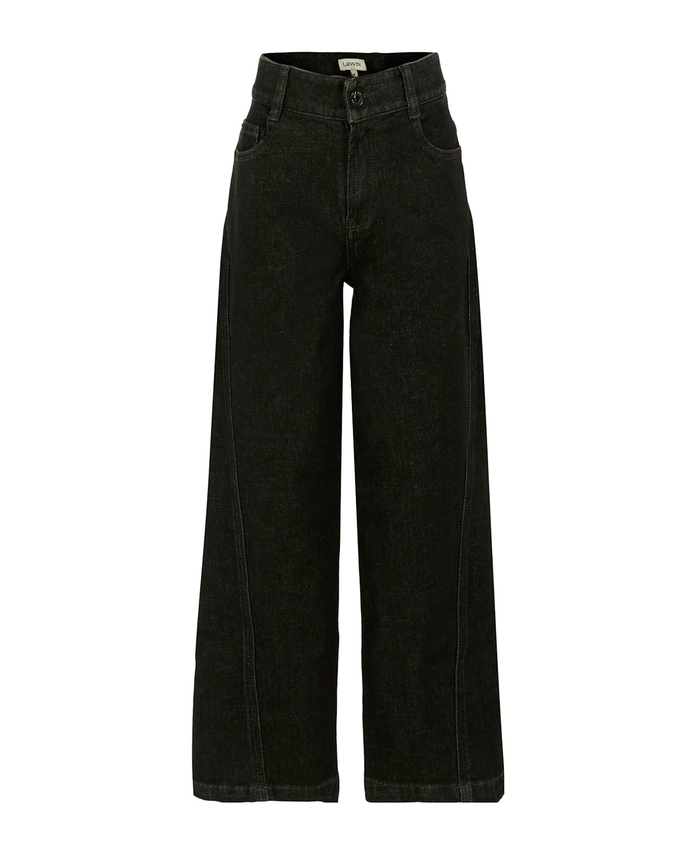 Black five-pocket jeans with belt loops, a front zip and snap button closure, and an adjustable waistband with internal elastic and buttons. They feature a faux leather pocket on the back. They are embellished with the L Lanvin logo on the back.