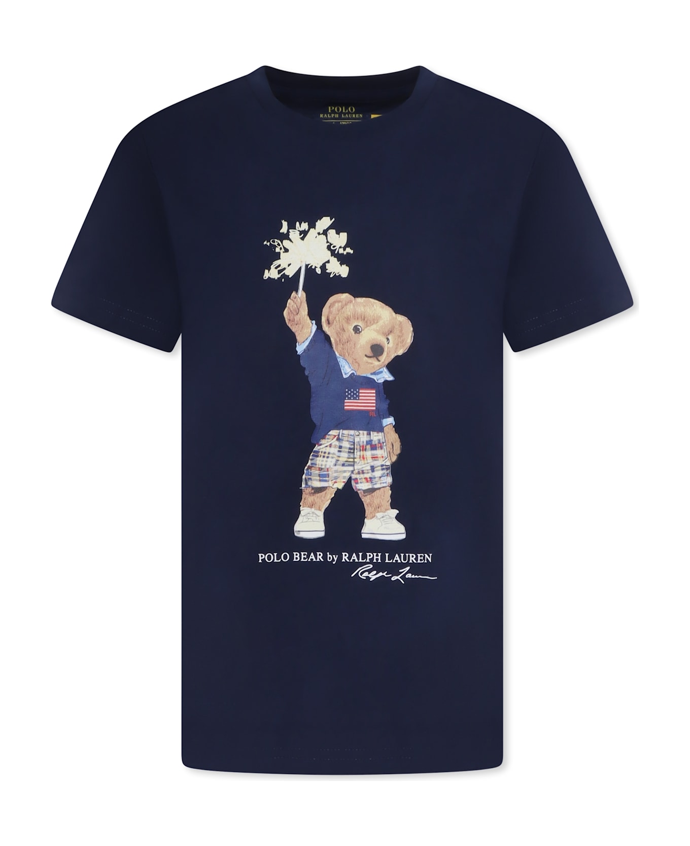 Blue cotton t-shirt, with short sleeves and ribbed crew neck. It is embellished with Polo Bear print and logo on the front.