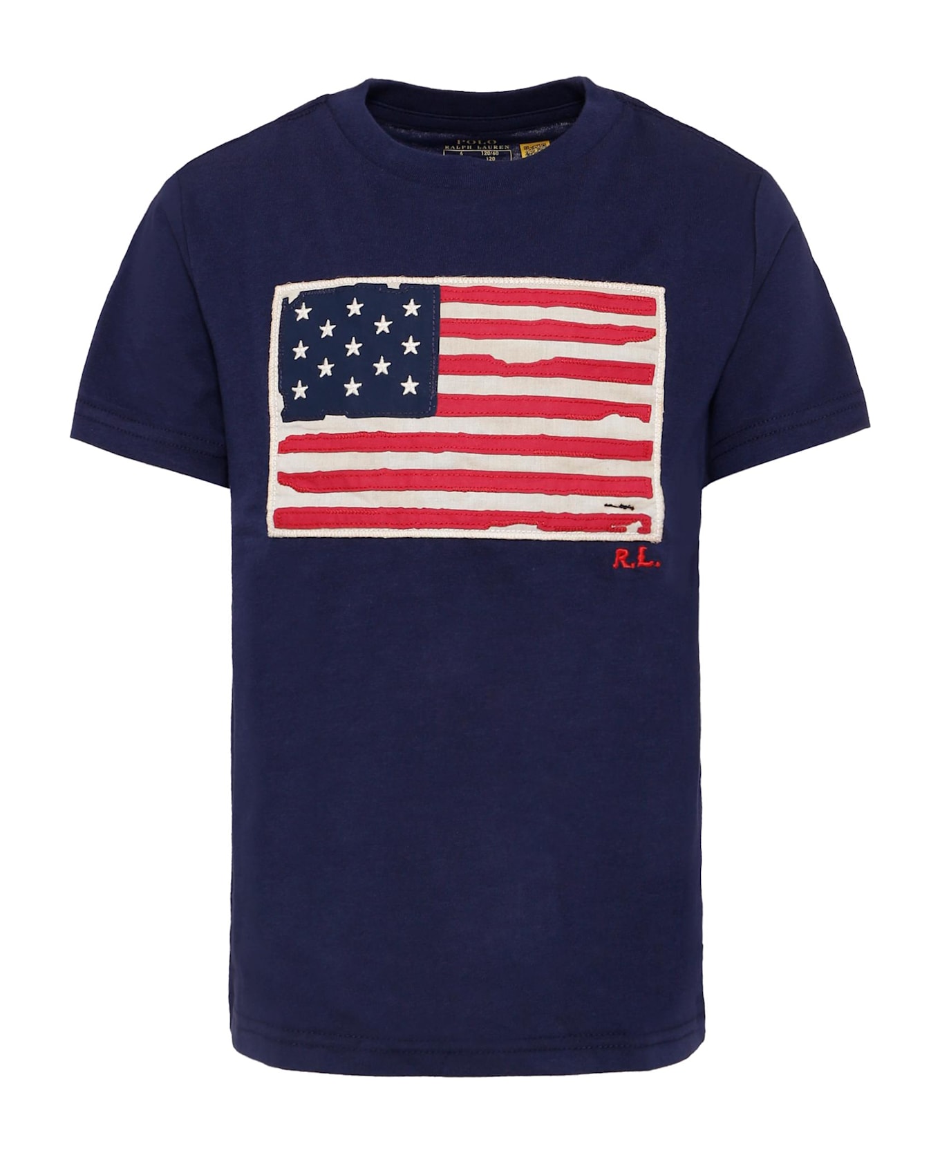 Blue cotton t-shirt, with short sleeves and ribbed crew neck. It is embellished with an American flag and embroidered logo on the front.