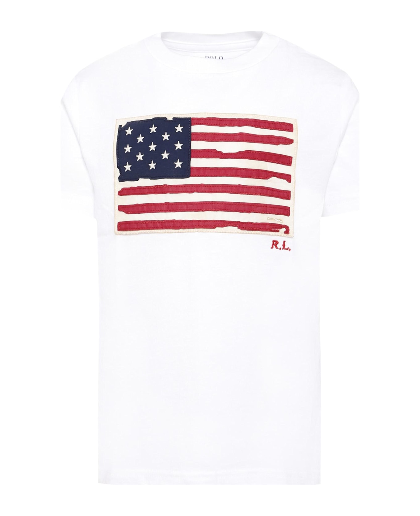 White cotton t-shirt, with short sleeves and ribbed crew neck. It is embellished with an American flag and embroidered logo on the front.