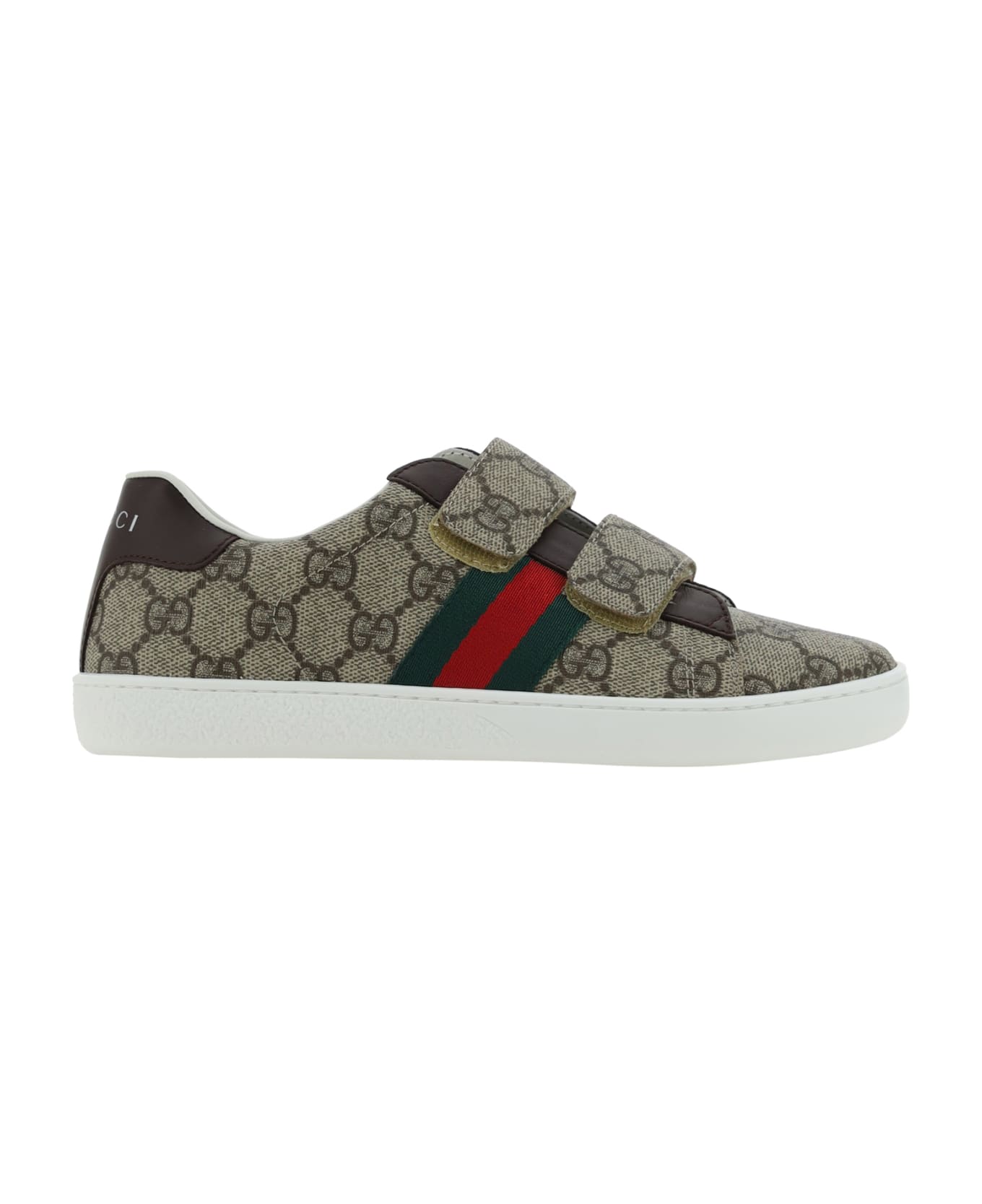 Sneakers for boy by gucci, front closure by velcro strap, webing side bands with iconic brand colors, flat sole, iconic all-over repeated gg supreme jacquard print. Composition: 60% % Polyurethane, 20% % Cotton, 20% % Polyester, 100% % Rubber