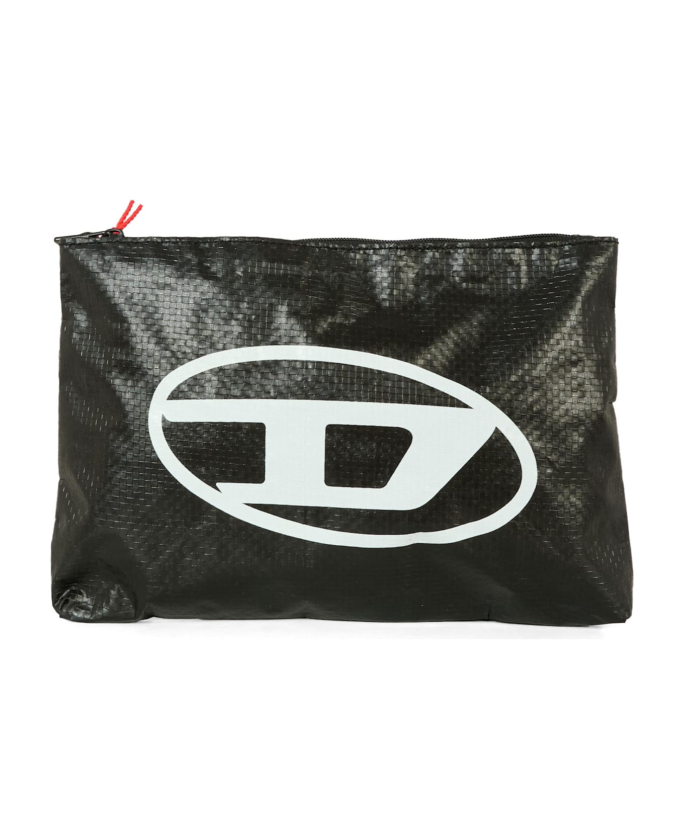 Black clutch bag with zip closure; it is embellished with a white logo on the front.