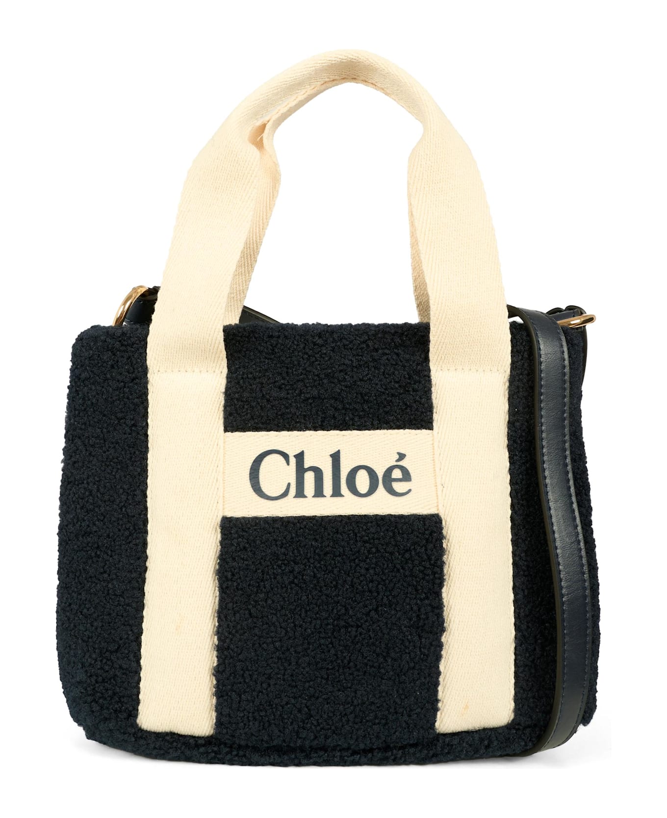Blue faux shearling bag with an internal magnetic button and front pocket. The adjustable shoulder strap and fabric handles add a practical touch. It is embellished with a logo band inspired by the classic women's "Woody".