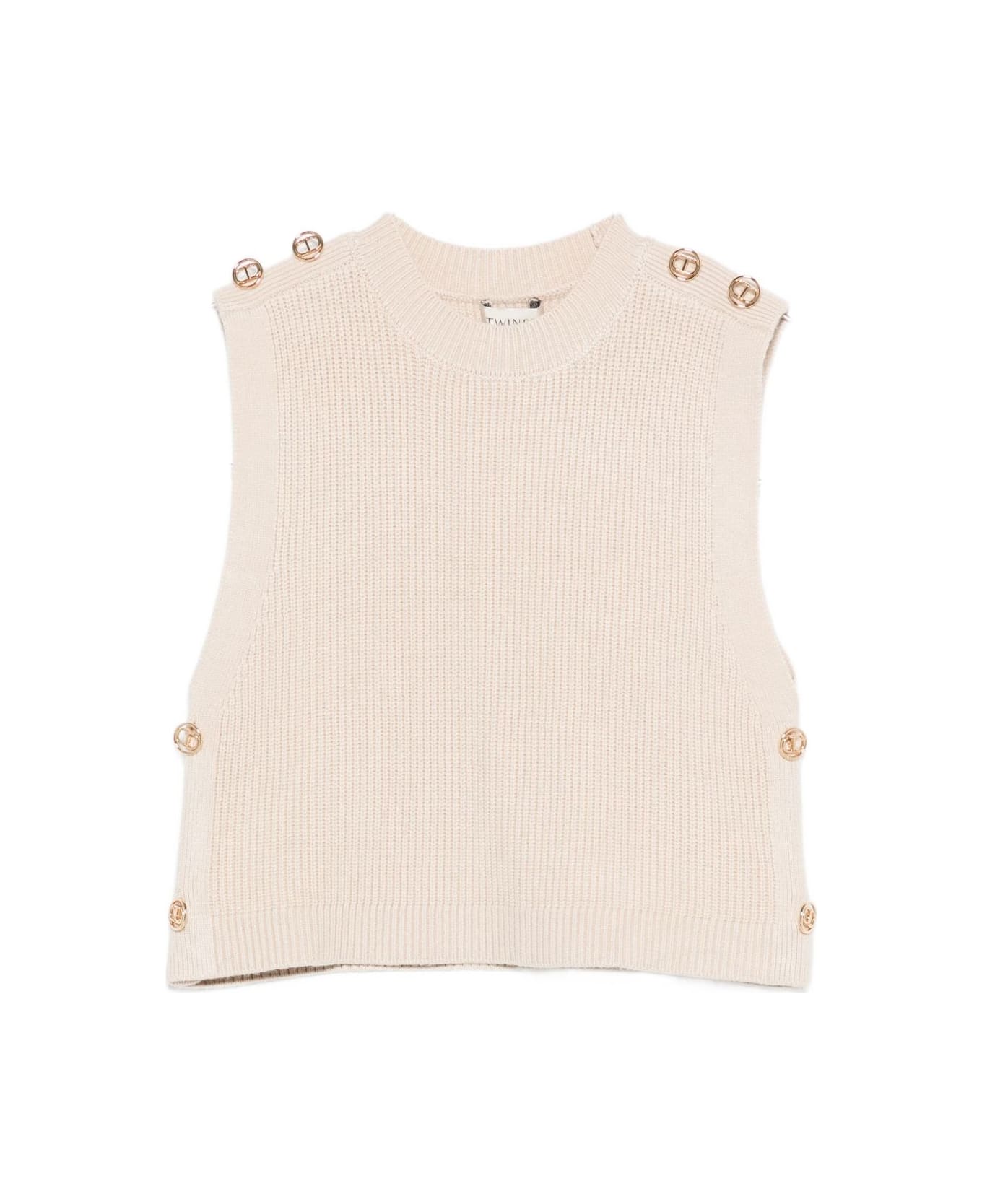 Features Beige Ribbed knit Crewneck Sleeveless design Gold decoration Composition 72% viscose, 28% polyester