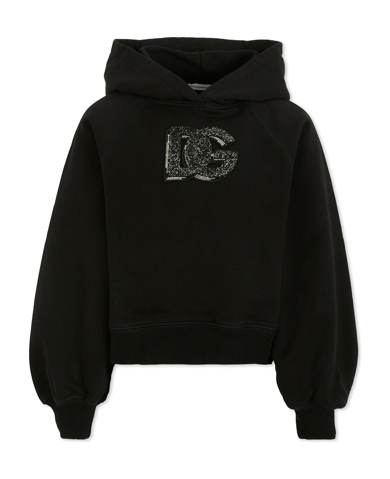 Black cropped sweatshirt from the luxury brand Dolce & Gabbana Kids, in lightly brushed cotton, with long sleeves, a hood, ribbed cuffs and hem. It is embellished with a DG logo in sponge with rhinestones and lurex.