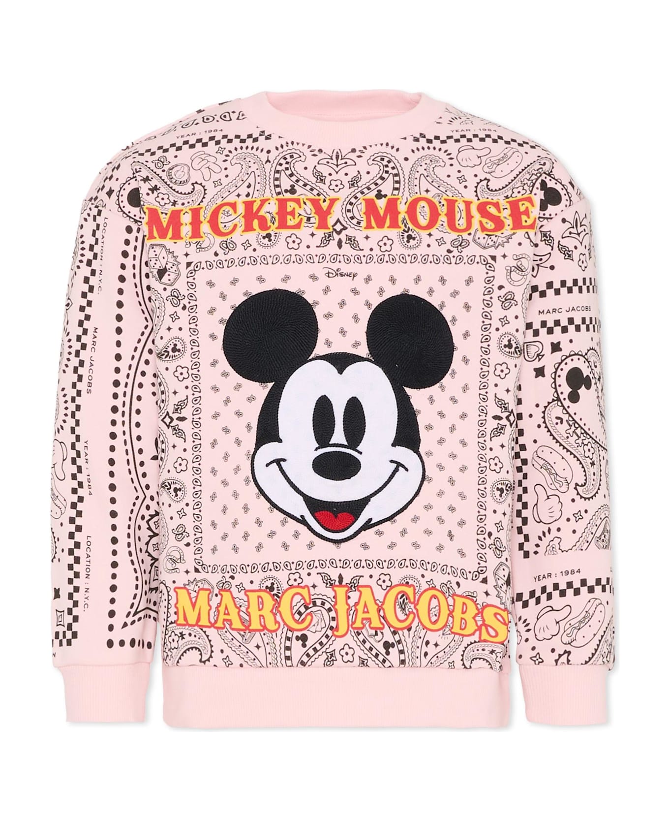 Pink brushed cotton sweatshirt with long sleeves, a crew neck, ribbed cuffs, and hem. It is embellished with embroidered Mickey Mouse and logo on the front and with an all-over paisley pattern. This is a Disney x Marc Jacobs collaboration.
