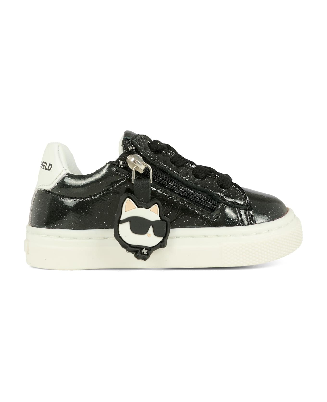 Black patent leather and lurex sneakers, with rubber soles, laces, a side zip, a white detail on the back, and a round toe. They are embellished with a Choupette-shaped patch on the side and a logo on the back.