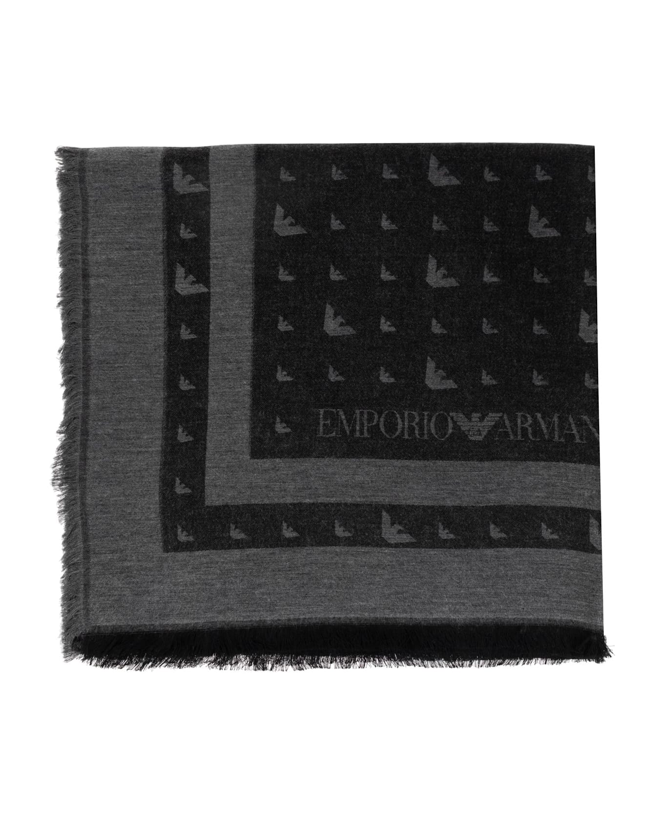 The Emporio Armani Logo Scarf is an exquisite embodiment of contemporary elegance and timeless sophistication. Crafted in a classic square silhouette, this accessory stands out with its refined blend of lightweight, soft viscose, ensuring a sumptuous feel and impeccable drape. A densely patterned motif of the iconic Emporio Armani eagle, set against an understated gray backdrop, radiates subtle opulence. Bold, wide borders are accentuated with repeated brand insignia and a prominent