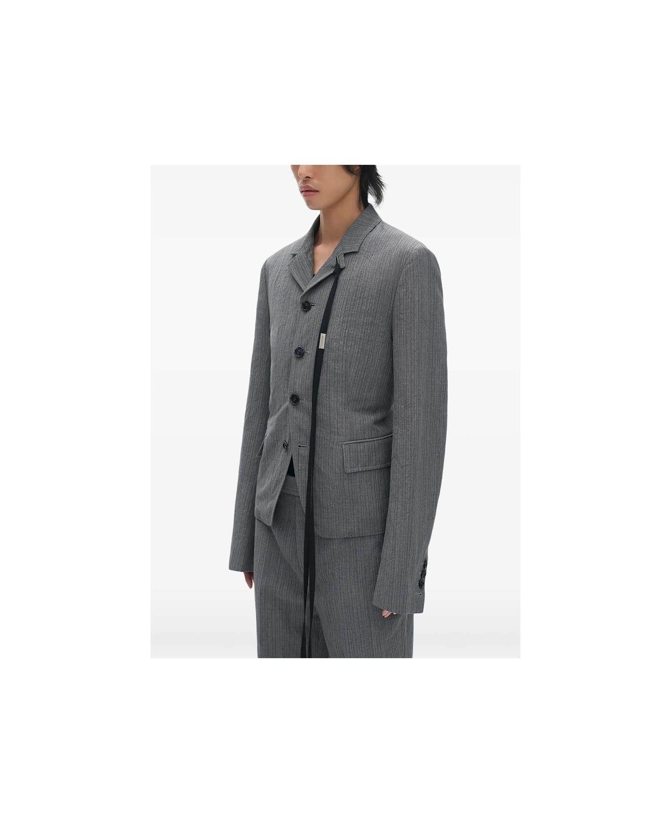grey pinstripe pattern ribbon detail button fastening front flap pockets notched lapels