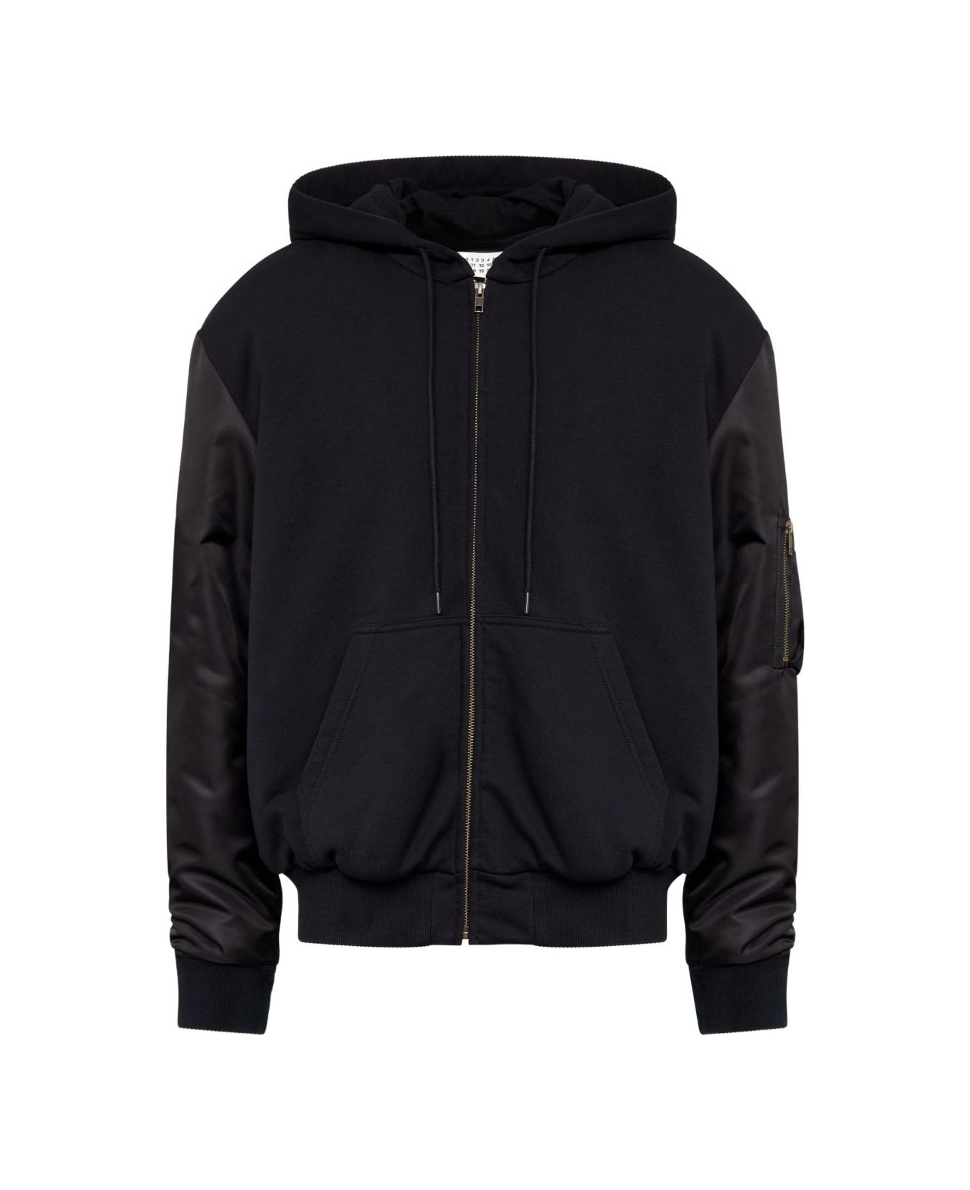 black cotton-blend drawstring hood zip fastening front pouch pocket sleeve patch-pocket Composition: Synthetic->polyester34. , 0% Natural (veg)->cotton66. , 0%