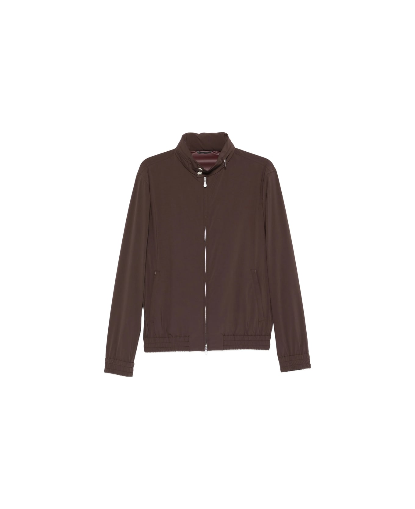 brown zip fastening stand collar elasticated cuffs side welt pockets elasticated hem