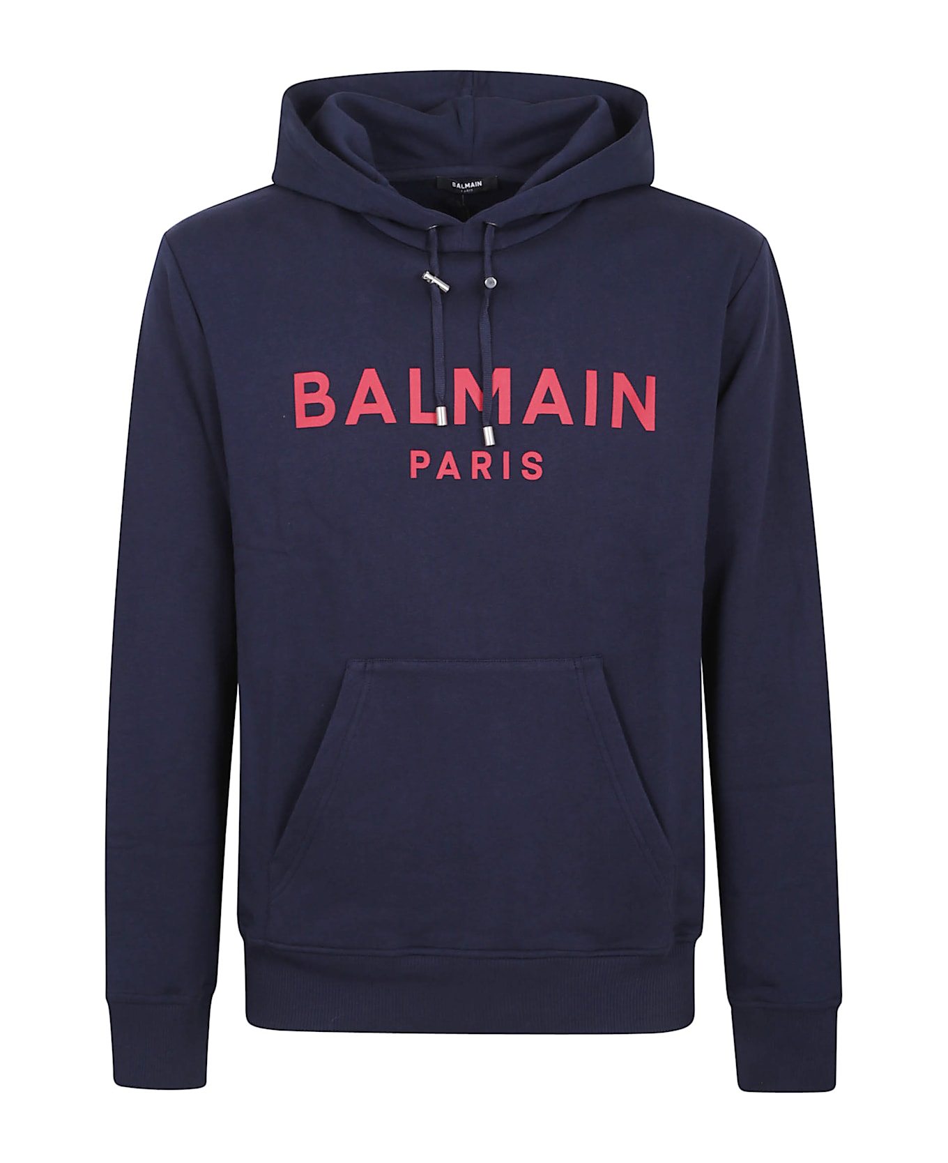 Pure cotton sweatshirt by BALMAIN. Drawstring hood; long sleeves; ribbed elastic cuffs and hem; front patch pocket. Regular fit. Featuring a contrasting BALMAIN PARIS print on the front.