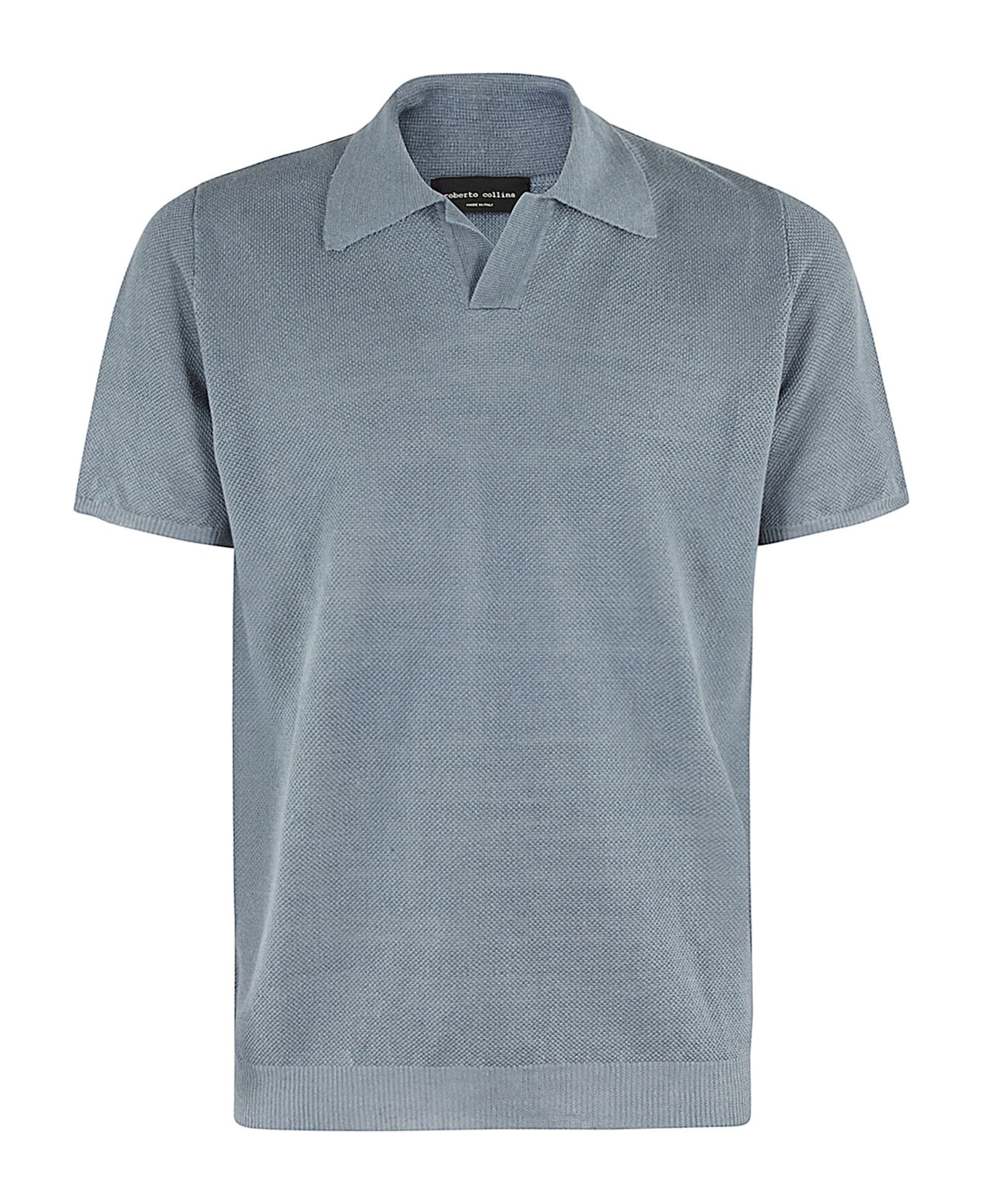 Polo shirt - Roberto Collina - Denim color - Pique stitch fabric - Polo collar - Short sleeve - Regular fit