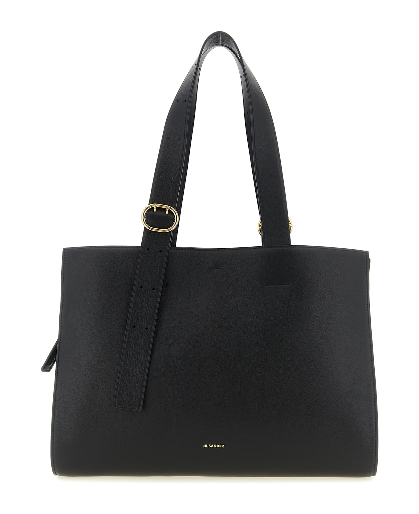 Leather shopping bag with front embossed logo, hook and inner zip closure, double adjustable handle with 'Cannolo' buckle, rigid base with metal feet, nappa lining. Composition: 100% calfskin leather (Bos Taurus)