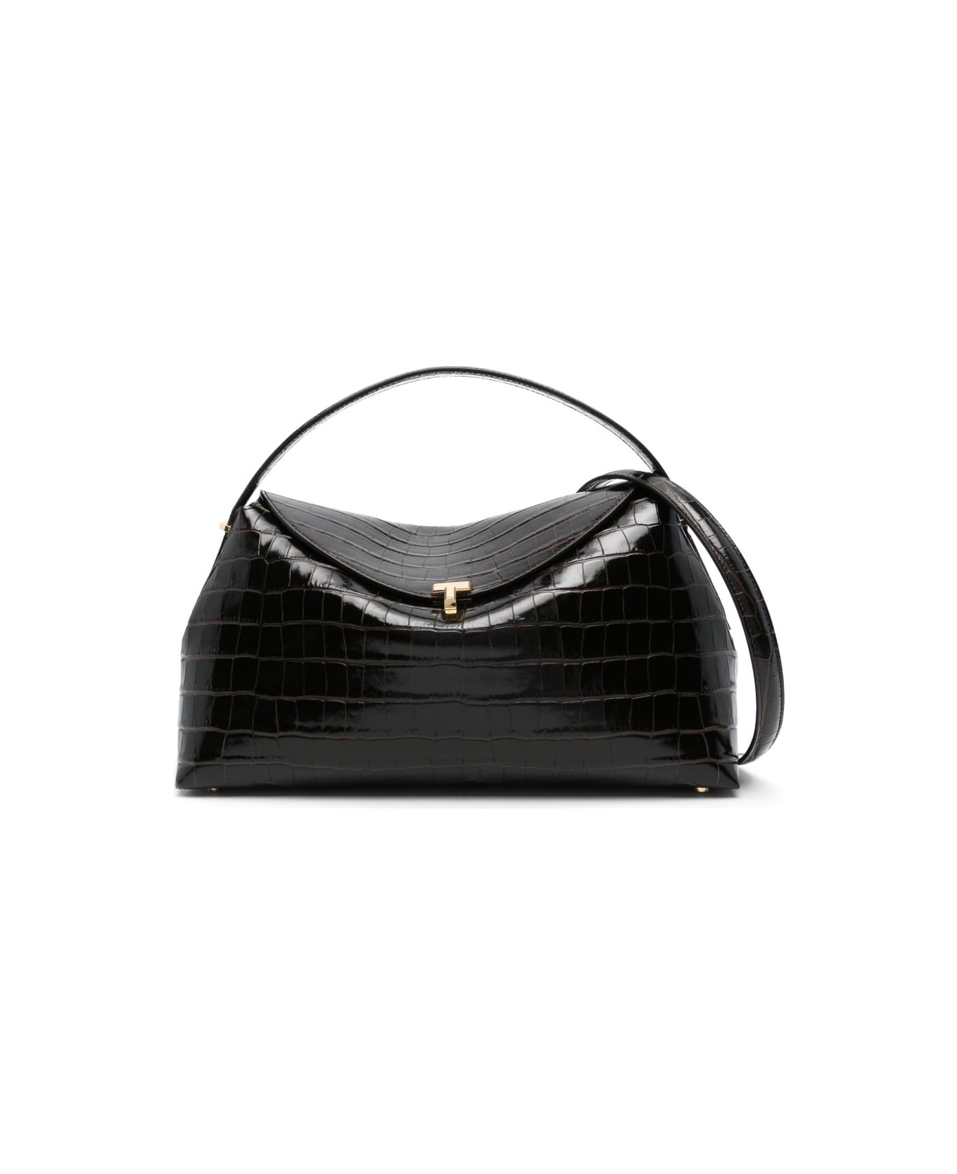 cedar brown calf leather embossed crocodile effect foldover top with T-Lock fastening single top handle adjustable detachable shoulder strap curve-edge body main compartment multiple internal slip pockets debossed internal logo metal feet This piece comes complete with a protective dust bag.
