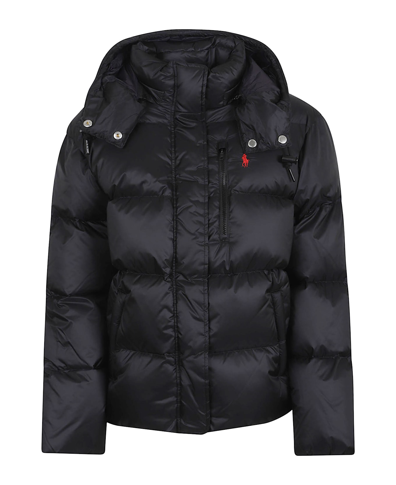 black recycled nylon padded with duck down, quilted design, detachable hood, front zip and snap button fastening, stand-up collar, distinctive Polo Pony motif, zipped chest pocket, long sleeves, elasticated cuffs, two side zipped pockets, fully lined, straight hem.