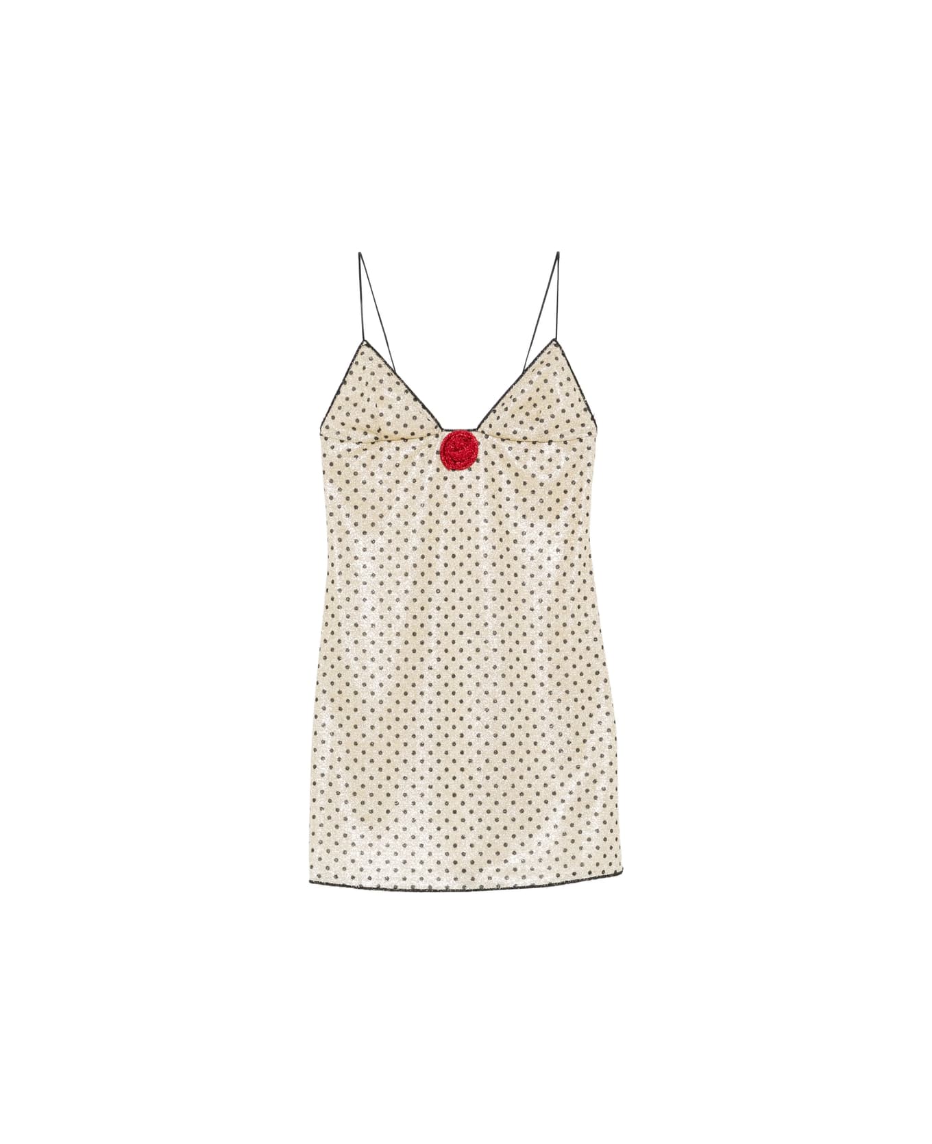 neutral and black polka-dot pattern appliqué spaghetti straps V-neck tonal piping