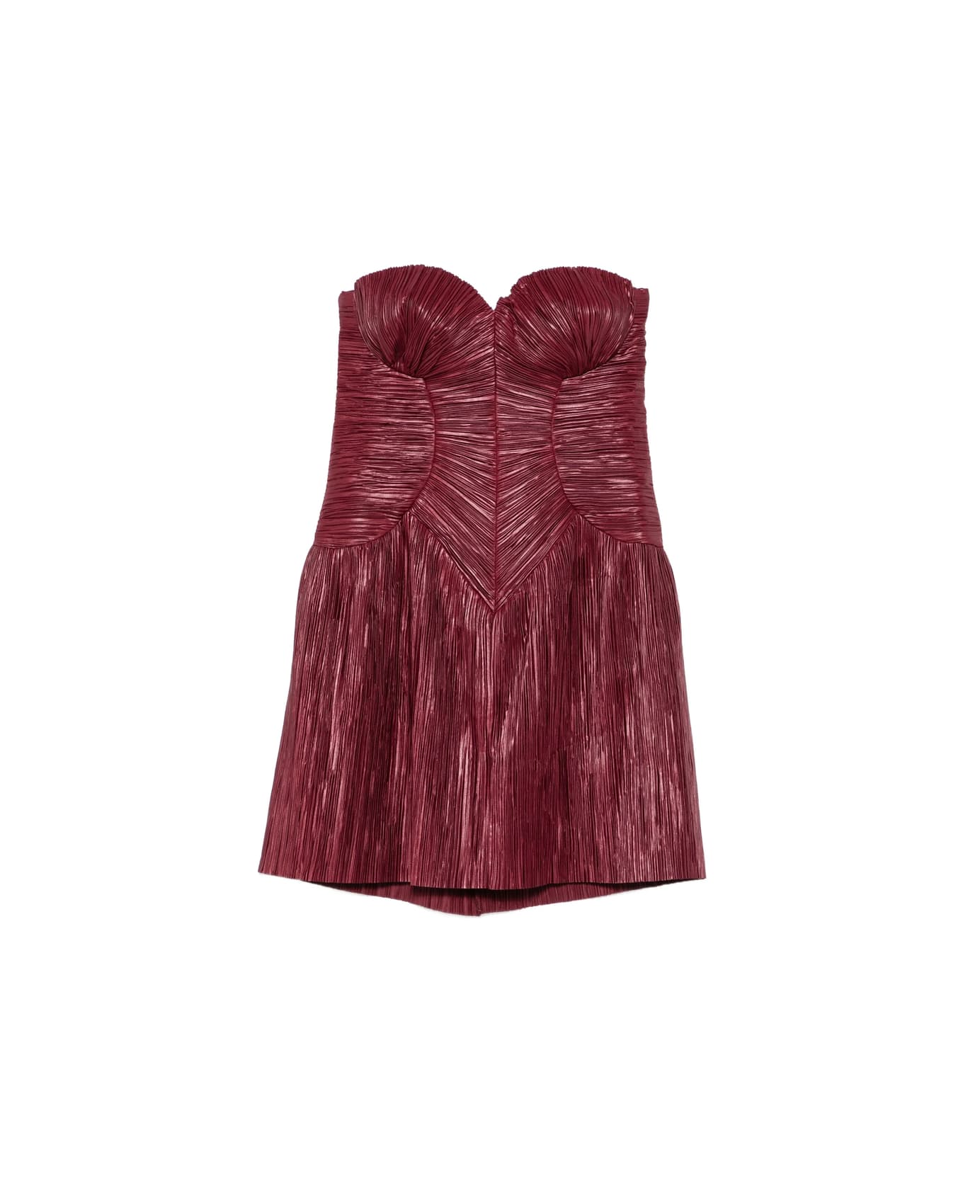 red pleated design strapless sweetheart neck mini length fitted bodice