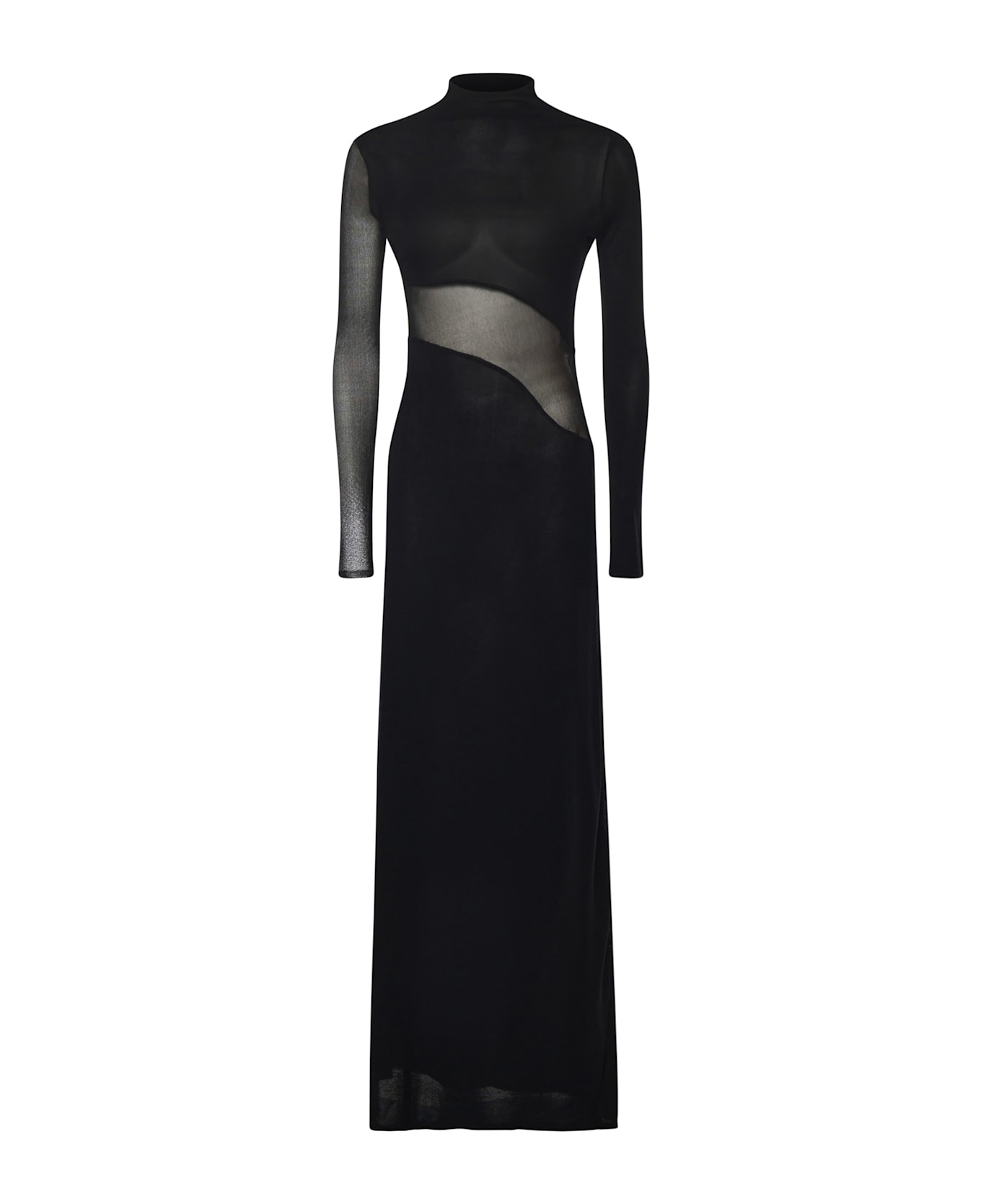 -Maxi length -High neck -Semi-sheer cut-out waist -Made in Italy -Color: Black