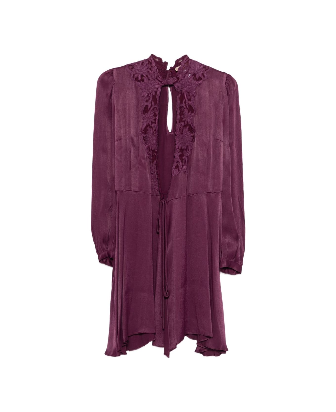 Features Purple Floral lace Drop neck Knot closure Long sleeves Ruffle hem Composition 100% viscose, 100% polyamide