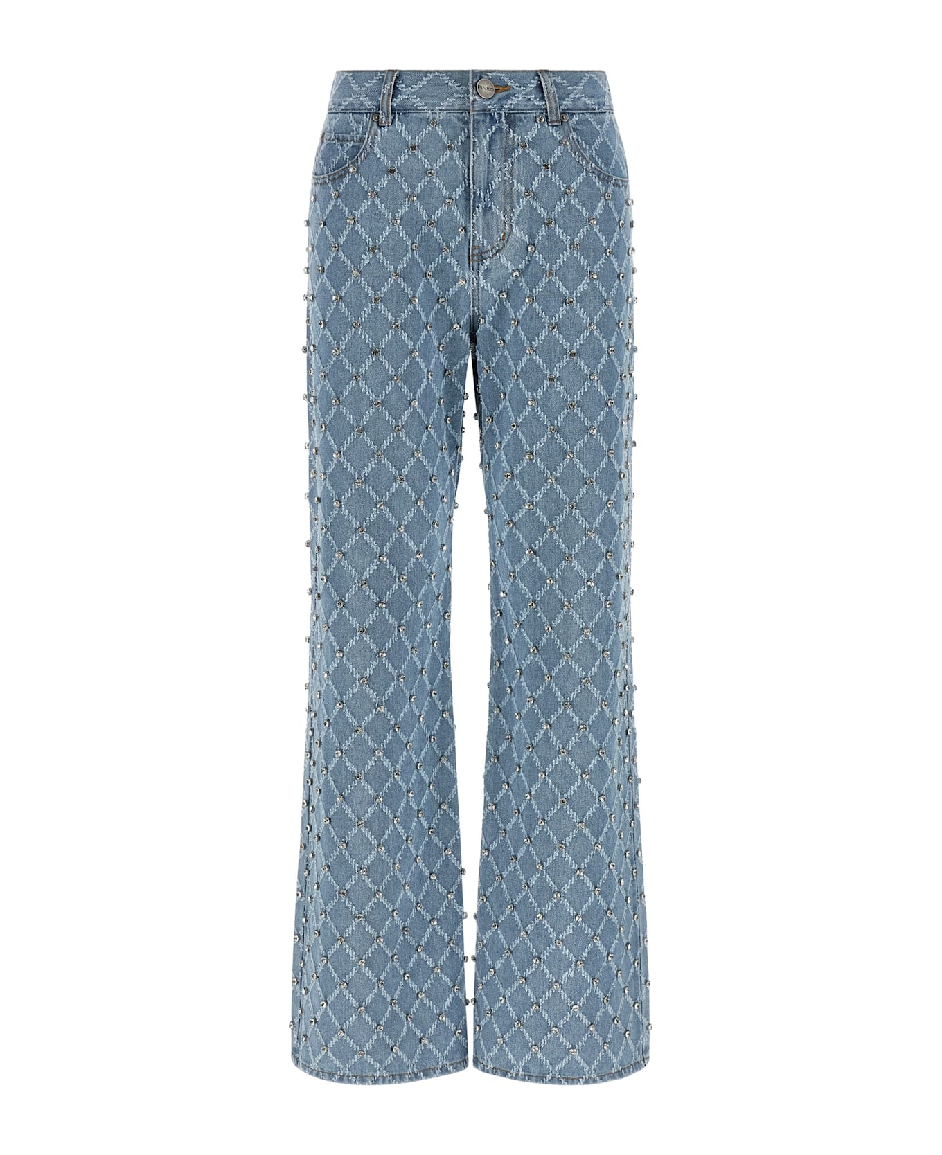 Wanda' cotton denim jeans with jacquard diamond pattern and all-over crystal appliqué, contrast stitching, front zip and button closure, five pockets, wide leg, and back logo embroidery.