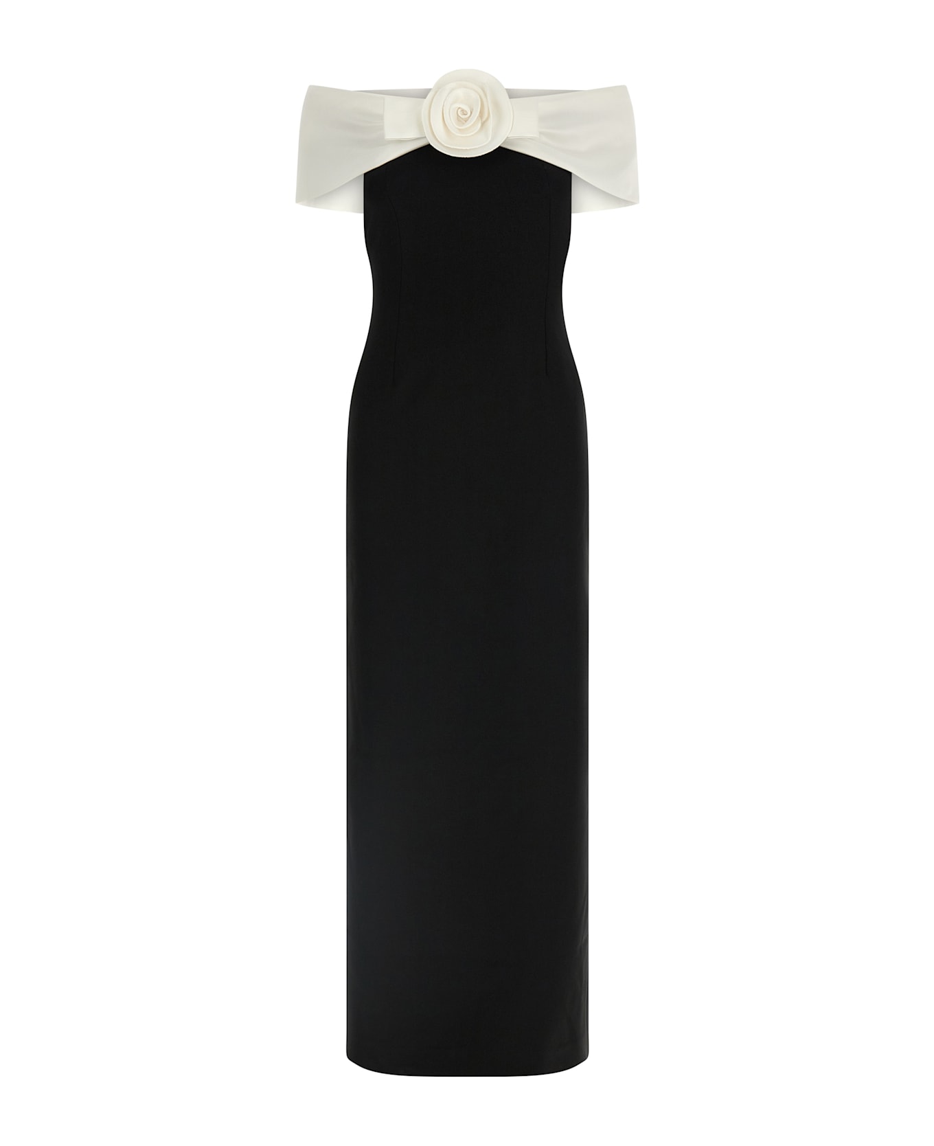 'Black Crêpe Flower Maxi' off-the-shoulder crêpe dress with column silhouette, sculptural bodice with enveloping detail on the shoulders contrasting with central flower, zip closure and back split, short sleeves, lining.