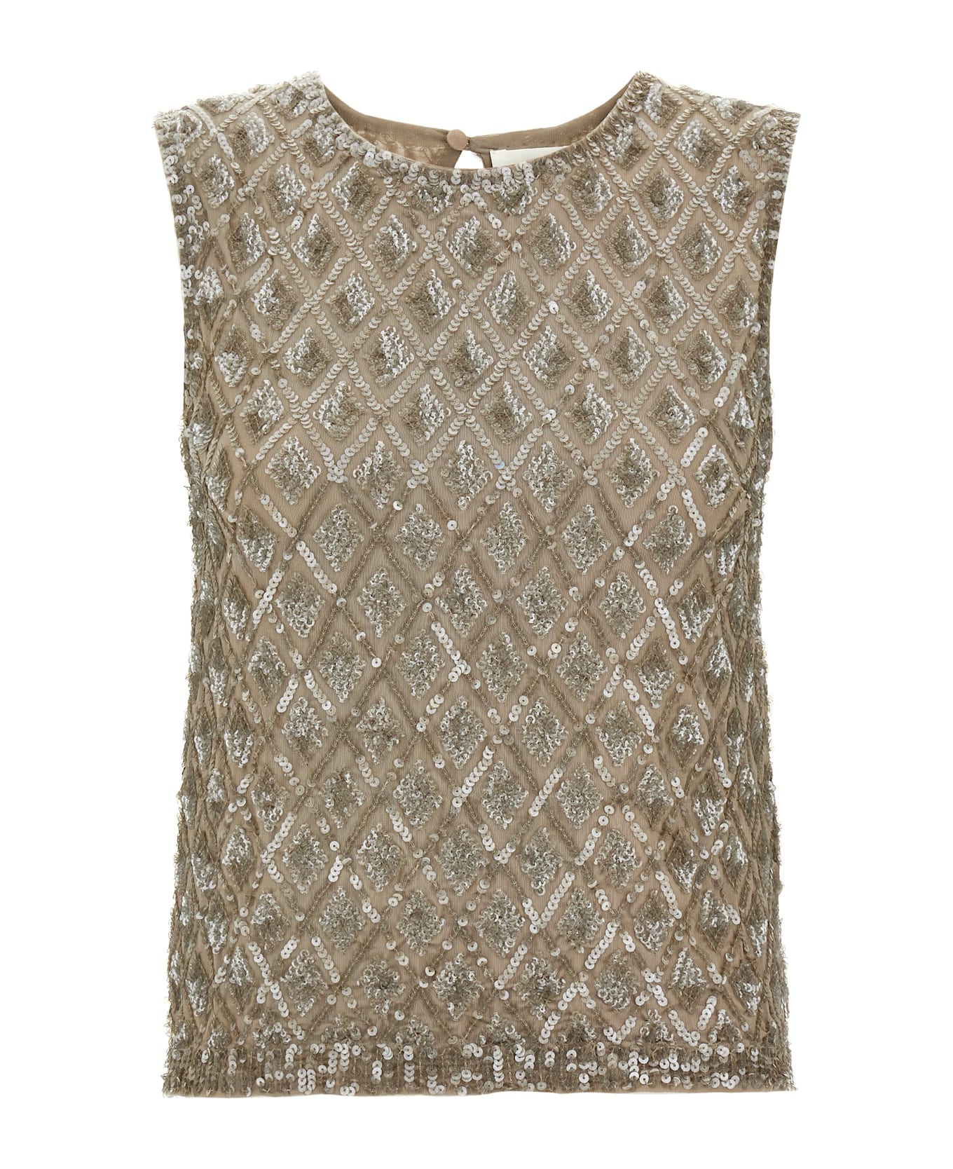 'Gild' sleeveless blouse with all-over sequin embroidery, back button closure and teardrop cut-out detail.